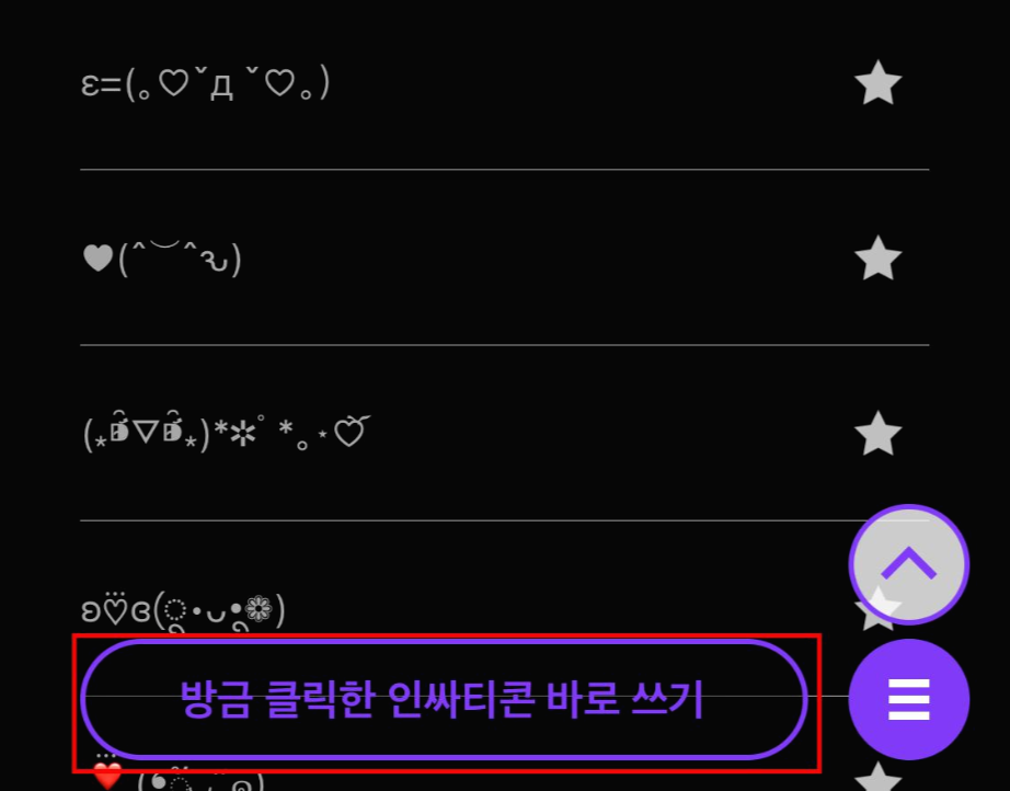 이모티콘을 둘러보다가 인스타그램에서 사용하고자 하는, 원하시는 특수문자를 찾으셨다면 해당 이모티콘을 눌러주세요. 해당 이모티콘을 선택하시면 아래에 [방금 클릭한 인싸티콘 바로 쓰기] 버튼이 나옵니다. 이 버튼을 눌러주세요.