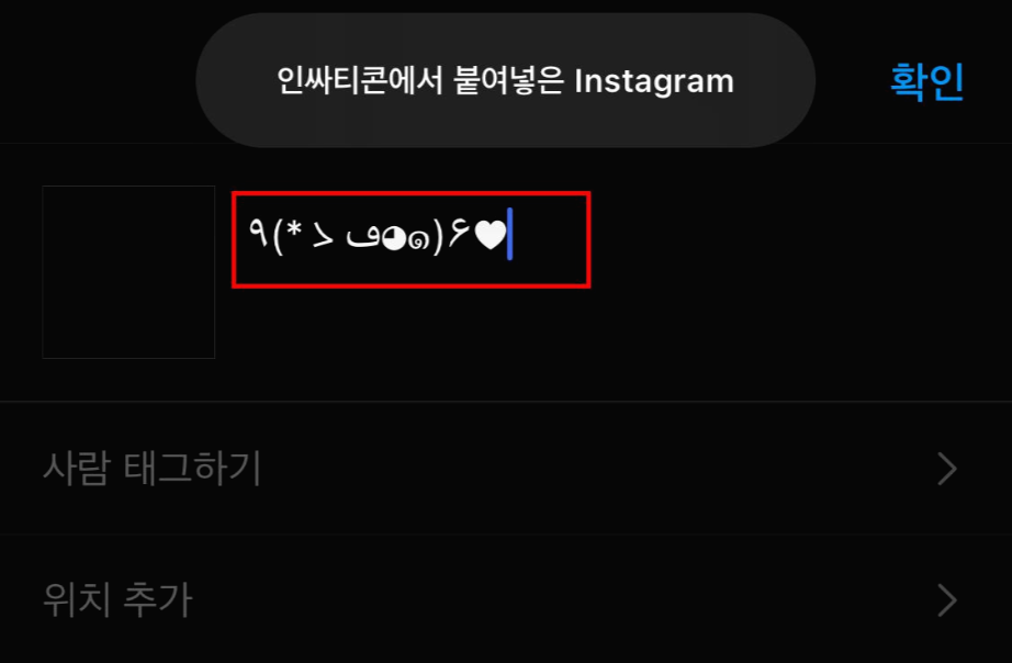[인스타그램] 앱을 실행하신 후 새 피드를 올릴 때 텍스트 글에 복사한 이모티콘을 붙여넣기 해주시면 위와 같이 선택한 이모티콘이 잘 입력되는 것을 확인할 수 있습니다. 이렇게 쉽고 빠르게 예쁜 이모티콘으로 인스타그램 피드를 꾸밀 수 있습니다.