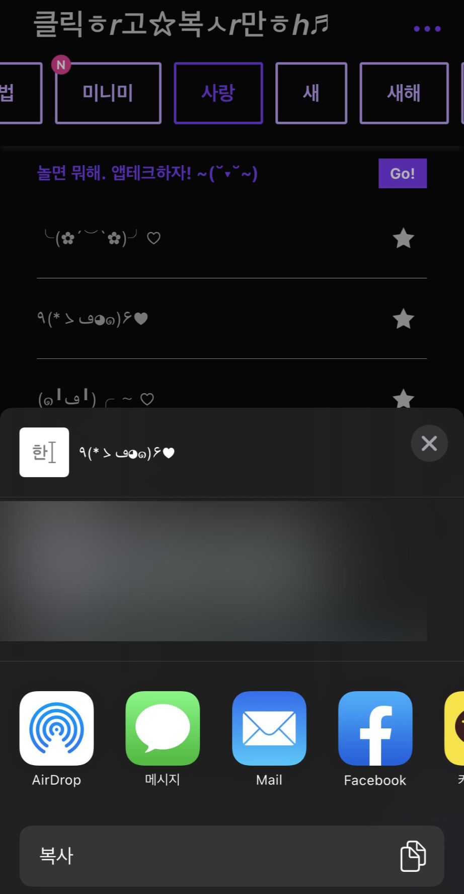 [메시지] 앱을 선택한 후 열린 메시지창에서 텍스트 입력란에 제가 선택한 이모티콘이 잘 입력된 것을 볼 수 있습니다. 이제 인스타그램 앱에서 확인을 해보도록 하겠습니다.