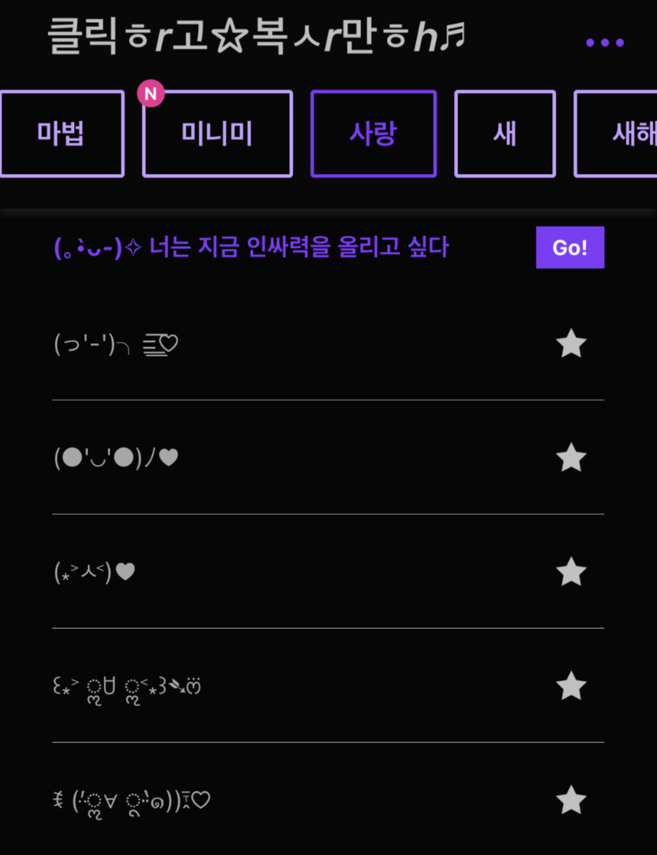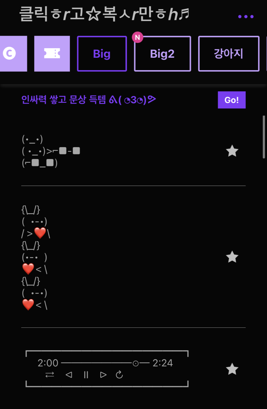 상단 메뉴 영역을 좌우 스크롤 해보시면 굉장히 많은 메뉴가 있습니다. 마법, 미니미, 사랑, 새 등 여러 이모티콘들이 있습니다. 하트와 제일 연관이 높은 사랑 메뉴를 눌러보기도 하고, Big 메뉴도 눌러보았습니다. 이모티콘 종류가 다양해서 예쁜 이모티콘들이 많이 있었습니다.