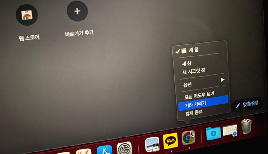 먼저, 현재 열려있는 프로그램을 강제종료해보겠습니다. 맥북 독에서 현재 열려있는 프로그램을 선택하신 후, 메뉴를 살펴보시면 현재 강제종료는 따로 없고 종료만 있습니다.