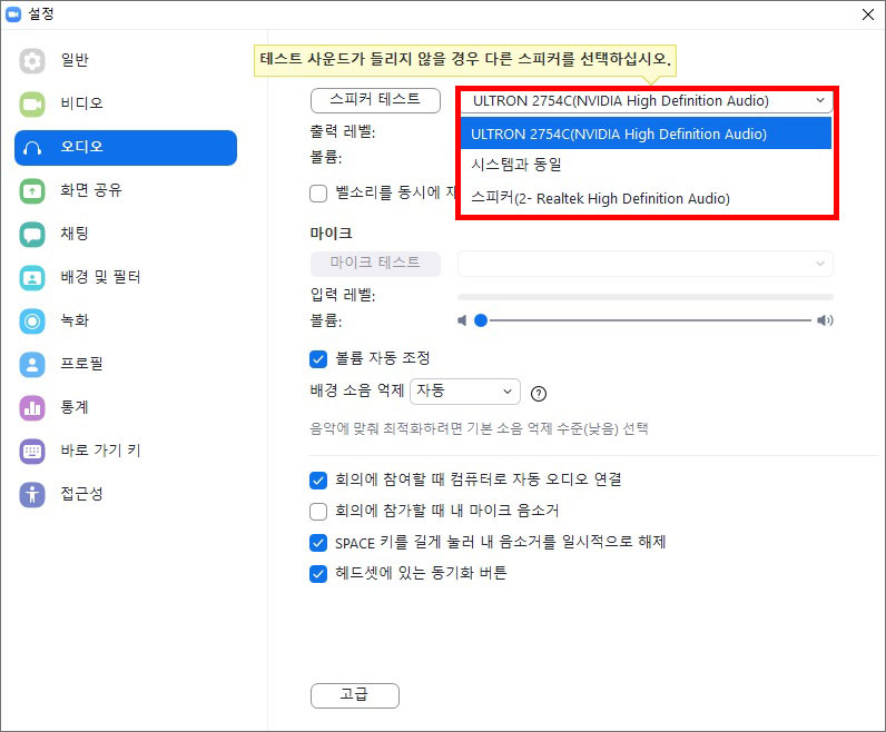 [설정]에서 스피커 선택이 잘 되었는지 확인하시고 회의 참여 시 컴퓨터로 자동 오디오 연결도 설정해주시고 다시 회의에 참가하시면 소리가 잘 들리실겁니다.