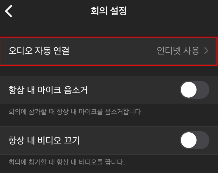 [회의 설정]에서 제일 상단에 있는 [오디오 자동 연결]을 확인해주세요. 위와 같이 오디오 자동 연결이 '끄기'로 설정되어 있으신 상태라면 ZOOM 소리가 안들리셨을 거예요.