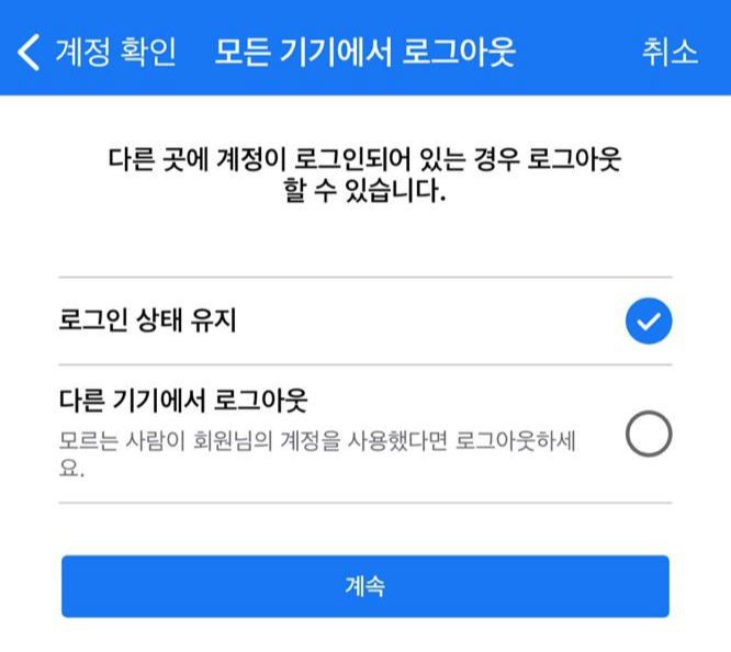본인 계정 확인이 완료되면 모든 기기에서 로그아웃을 할 것인지 선택이 가능합니다. 기존에 다른 곳에 계정이 로그인이 되어 있다면 로그인 상태 유지를 선택할 수도 있고, 다른 기기에서 로그아웃을 선택할 수도 있습니다.