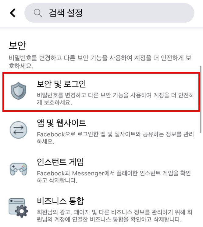 [설정]을 눌러주신 후 [보안 영역]에 보시면 상단에 [보안 및 로그인] 항목이 있습니다. [보안 및 로그인] 항목을 눌러주세요.