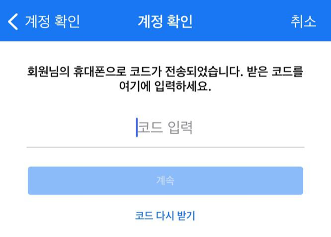 저는 [SMS로 확인]을 선택해서 진행했습니다. 그러면 휴대폰으로 코드가 전송이 되고 받은 코드를 입력하셔서 계정을 확인해주시면 됩니다.