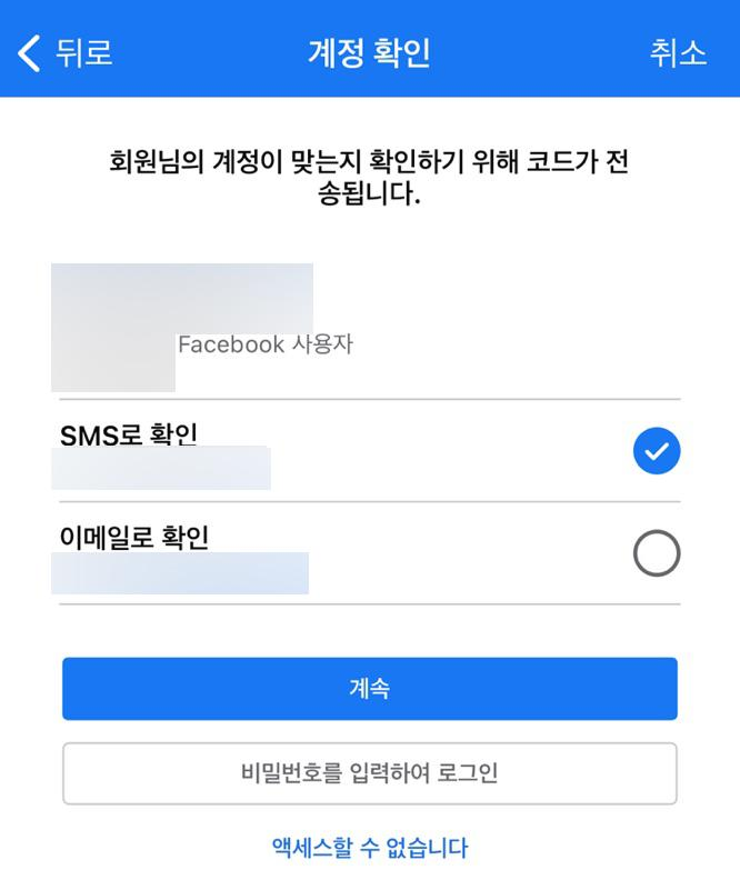 휴대폰 번호나 이메일 주소를 입력해서 계정을 찾아주시면 관련된 정보가 등록된 계정을 안내해줍니다. 계정 확인에 나오는 계정이 내 계정이 맞는지 확인해주세요. 내 계정이 맞다면 [SMS로 확인] 또는 [이메일로 확인]을 선택해서 비밀번호를 찾을 수 있습니다.