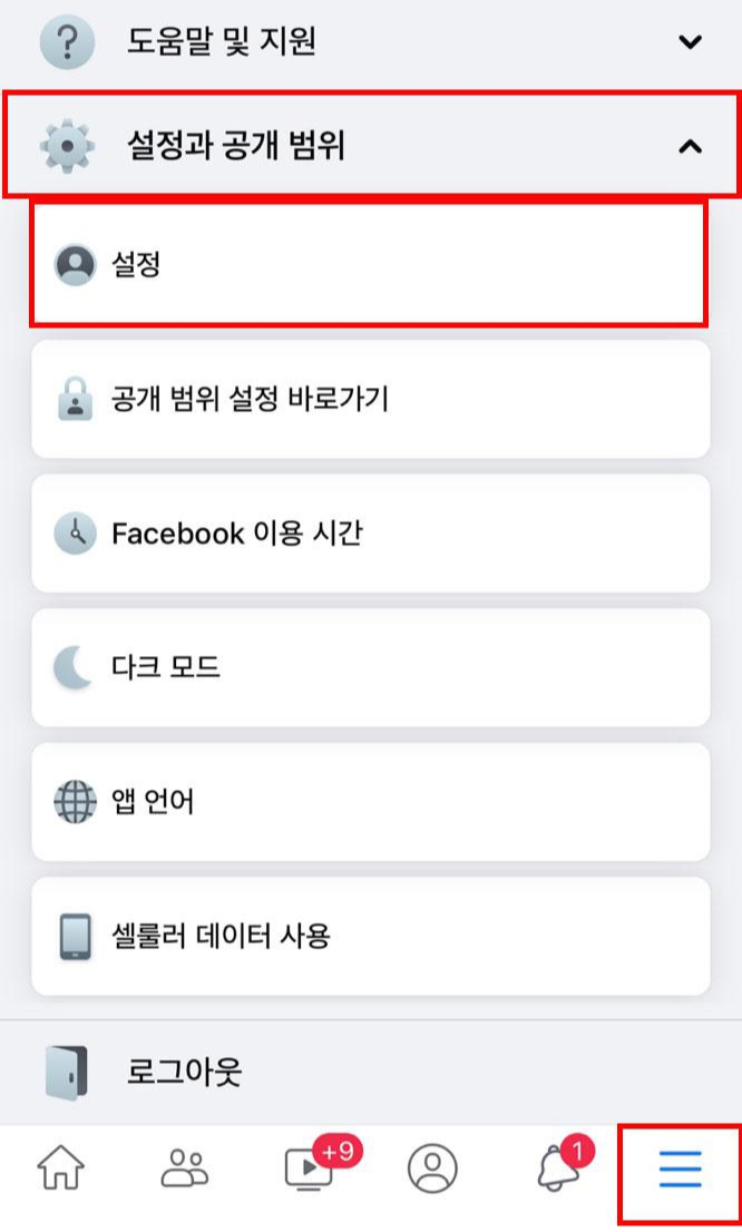 이번에는 페이스북 이용 중에 비밀번호 변경하는 방법을 알아보도록 하겠습니다. 하단에 있는 메뉴바에서 맨 오른쪽에 있는 메뉴를 눌러주신 후 조금 아래로 내려보시면 [설정과 공개 범위]가 있습니다. [설정과 공개 범위]를 누르신 후 제일 상단에 있는 [설정]을 눌러주세요.