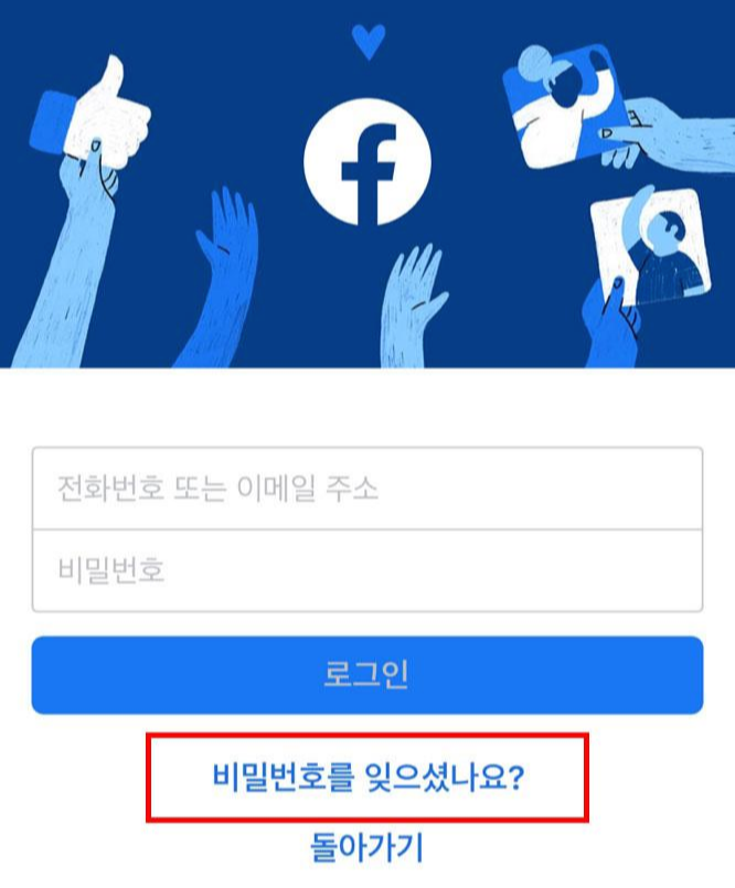 먼저, 페이스북 앱을 실행해주세요. 앱을 실행해보시면 가운데에 [비밀번호를 잊으셨나요?] 라는 버튼이 있습니다. 비밀번호를 잊어서 기억이 나지 않으시는 경우에는 비밀번호를 찾기 위해서 해당 버튼을 눌러주세요.