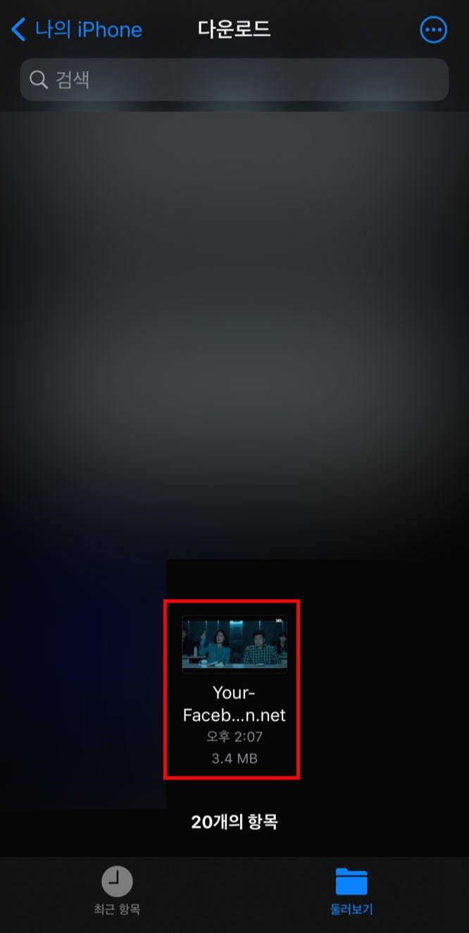 저같은 경우에는 아이폰에서 [파일] - [다운로드] 폴더에 들어오니 페이스북 영상 다운로드 받은 영상 파일을 찾을 수 있었습니다. 그럼 제대로 재생이 잘 되는지 파일을 열어서 확인을 해보도록 하겠습니다.