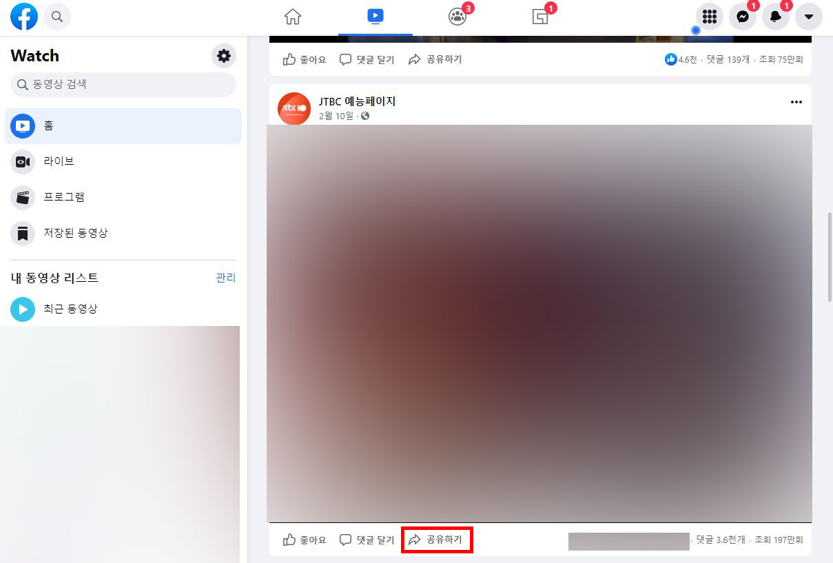 PC에서 페이스북 접속하신 다음 영상 게시글을 보시면 하단에 [공유하기] 버튼이 있습니다. [공유하기] 버튼을 눌러주세요.