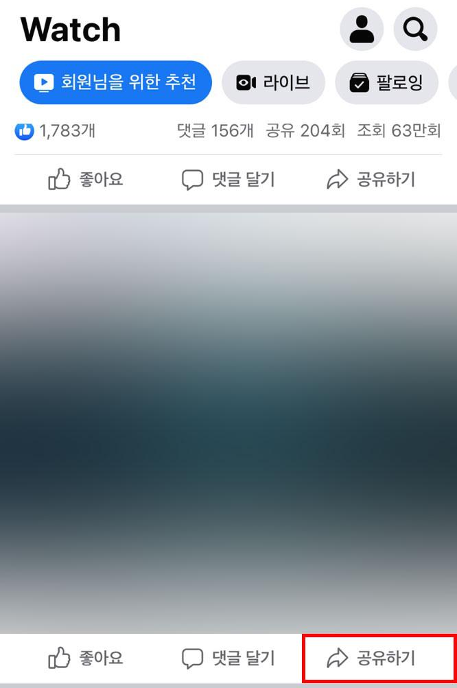 이번에는 모바일에서 페이스북 영상 다운로드 하는 방법을 알아보겠습니다. PC와 마찬가지로 영상 게시글 하단에 있는 [공유하기]를 눌러주세요.