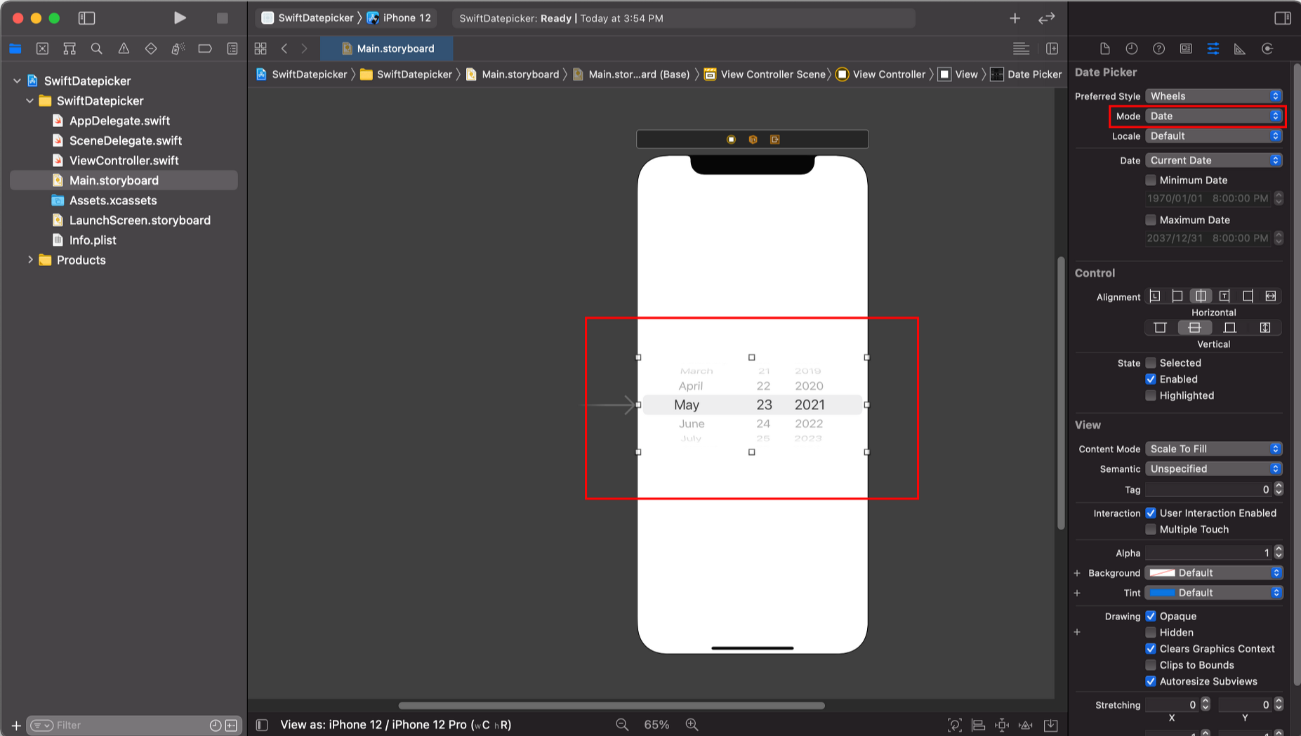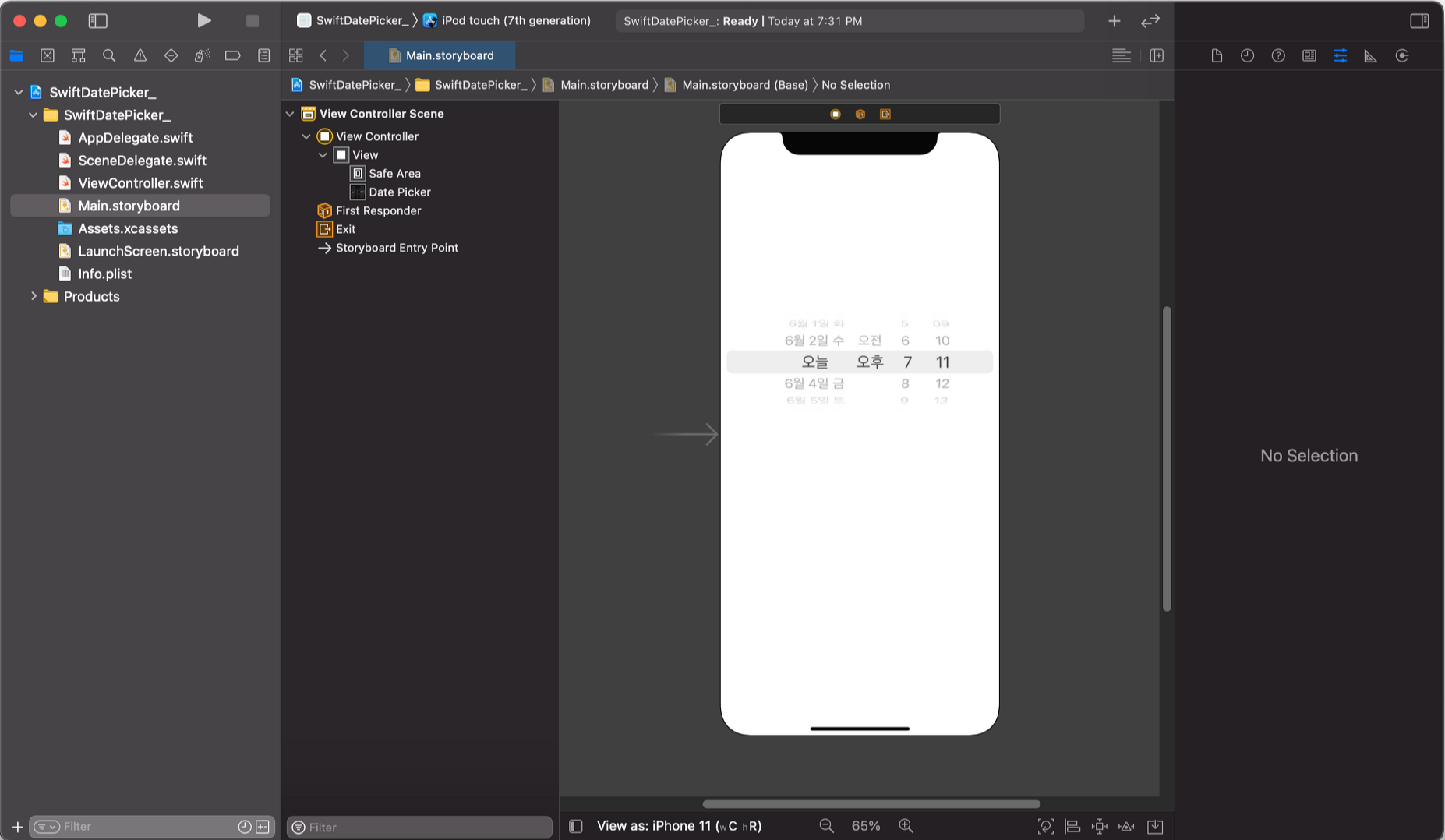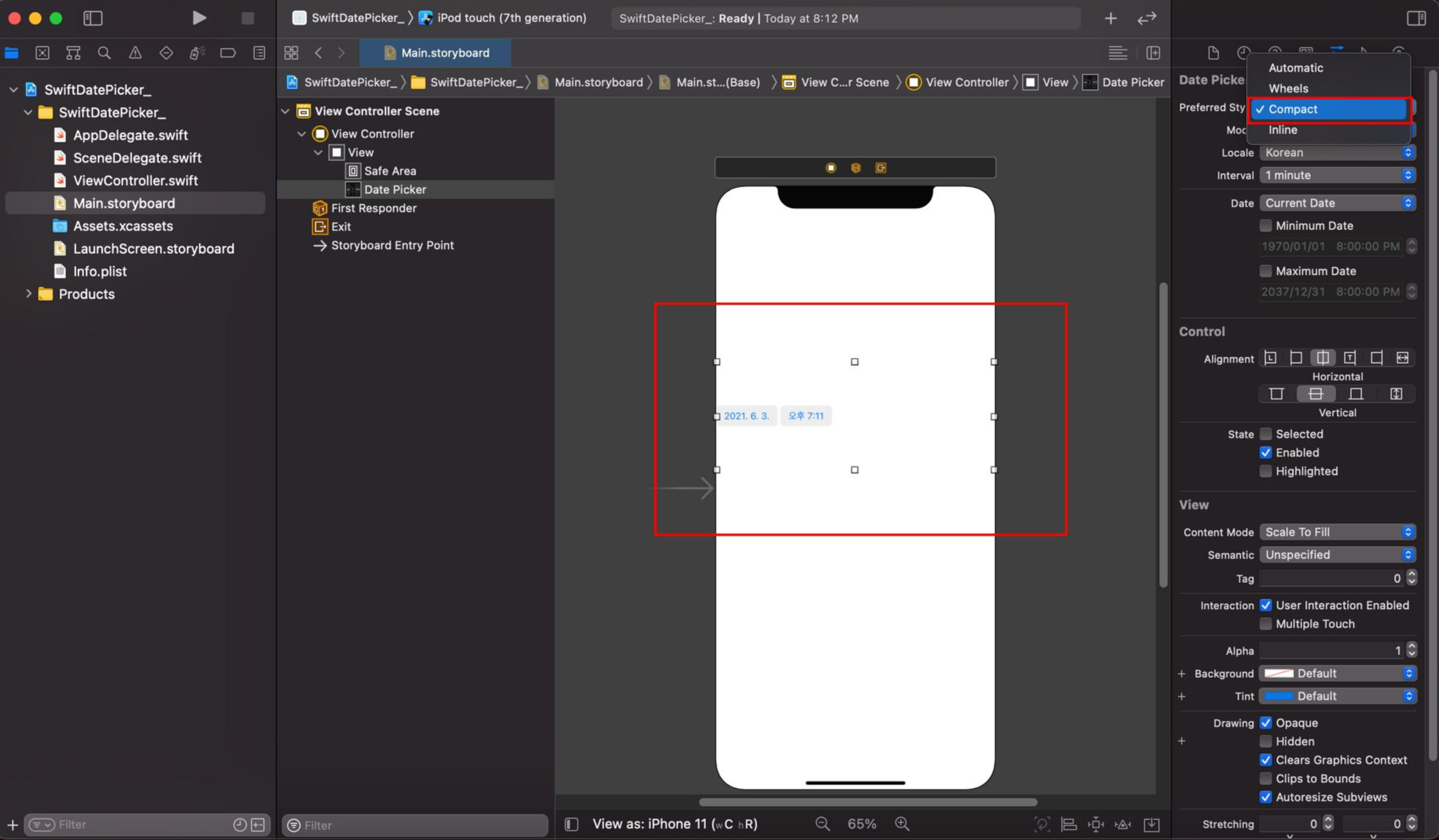 현재 데이트 피커의 모드는 [날짜&시간형 (Date and Time)]으로 설정되어 있습니다. 인스펙터 영역의 [Mode] 항목을 통해서 데이트 피커의 모드를 변경할 수 있습니다.