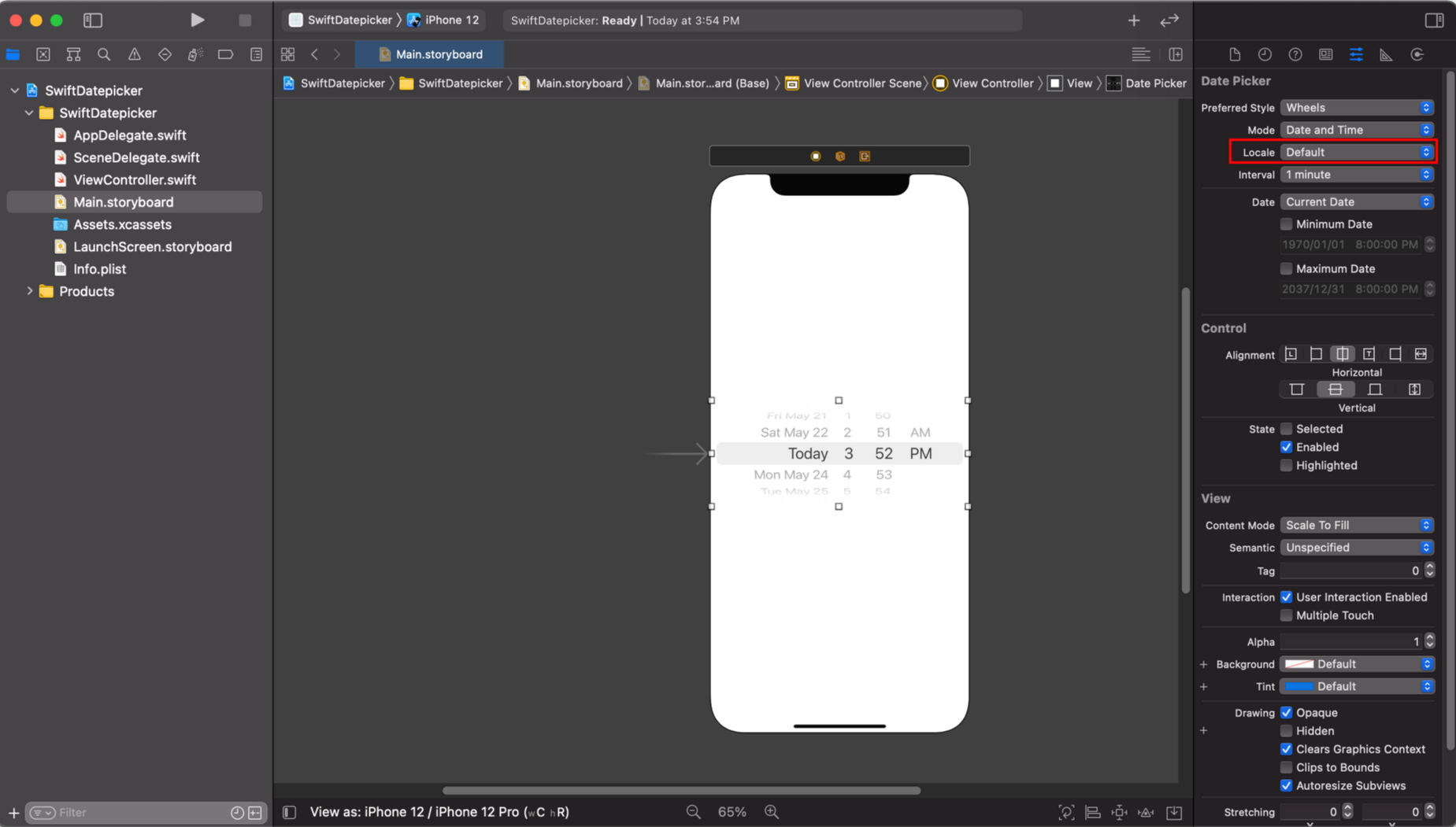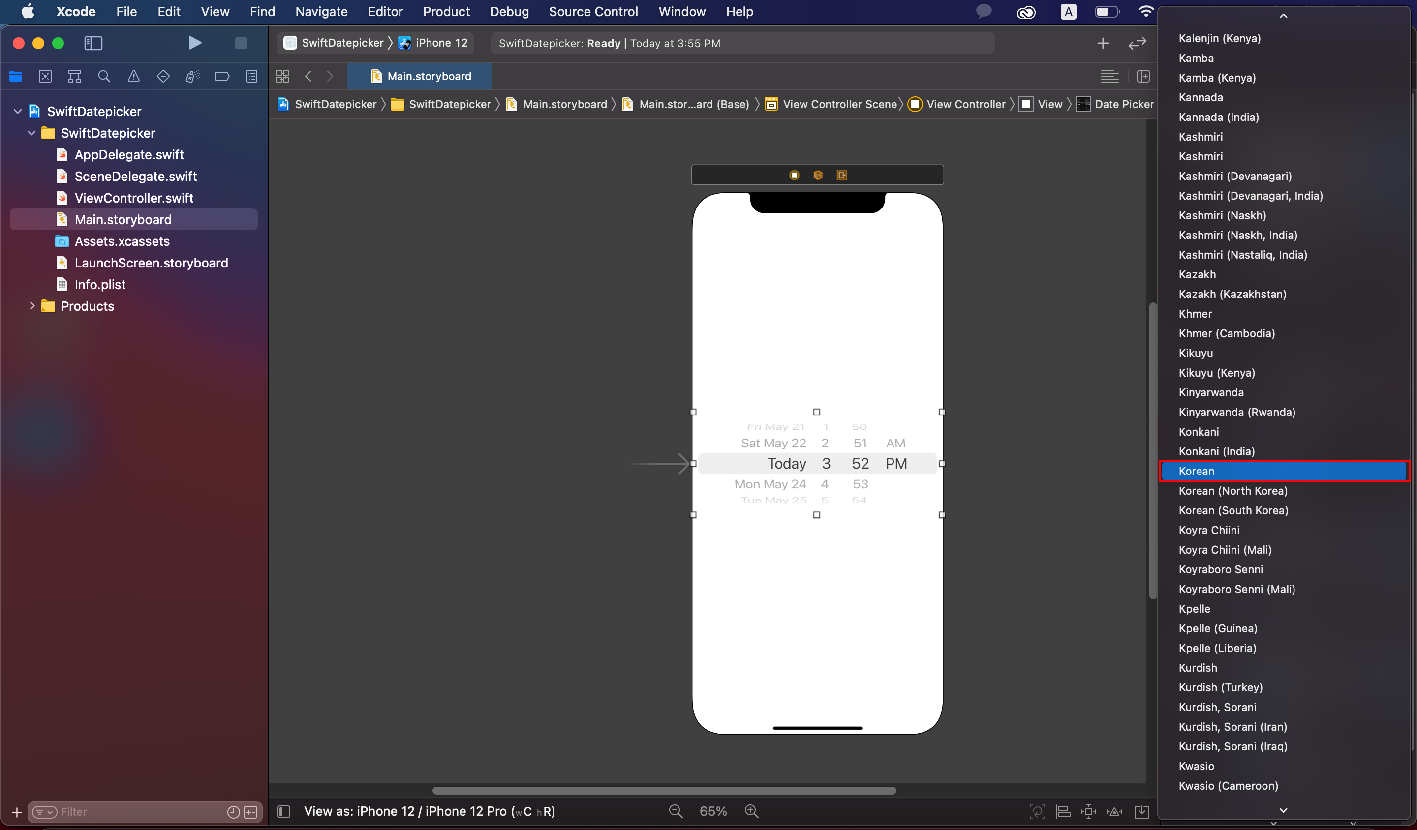 데이트 피커(Date Picker)의 언어는 변경이 가능합니다. 기본적으로 데이트 피커의 언어는 영어로 설정이 되어 있지만, 인스펙터 영역에서 언어 변경이 가능합니다. [Locale] 항목을 통해서 원하시는 데이트피커 언어를 설정해주시면 됩니다.