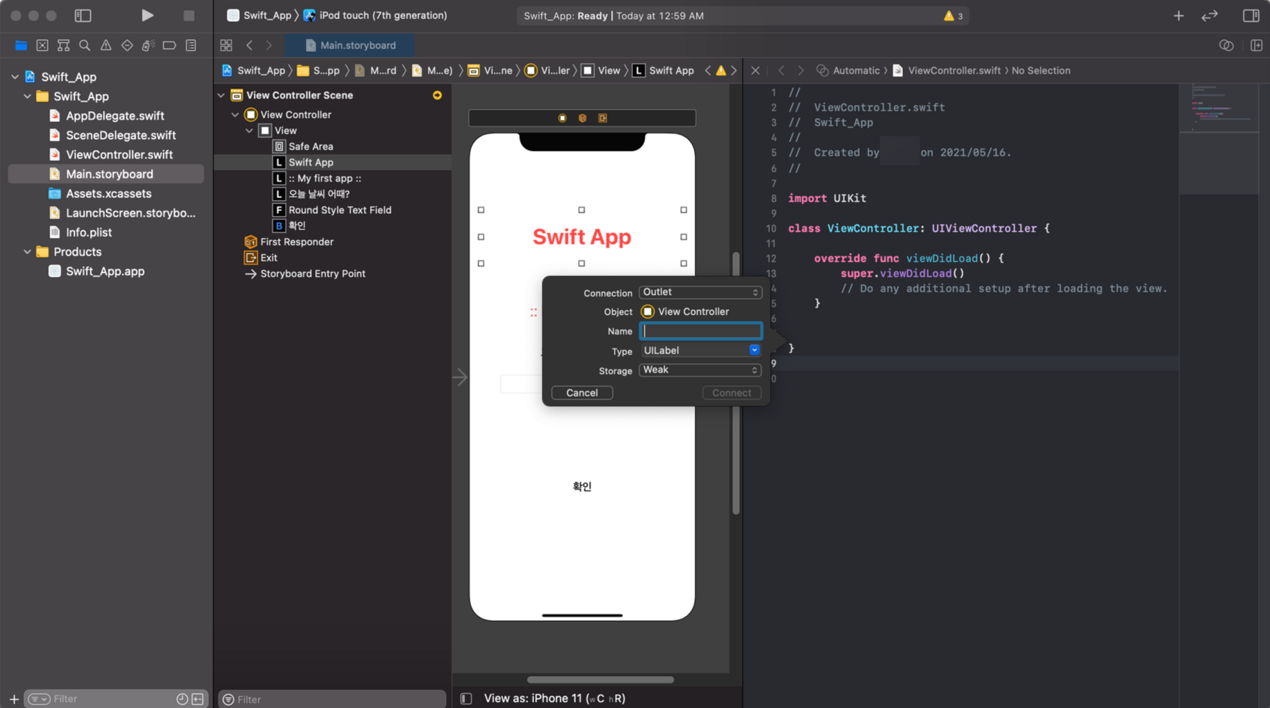 아웃렛 변수의 Name은 원하시는 대로 설정해주시면 됩니다. 저는 'label_swiftapp'으로 설정해보았습니다.