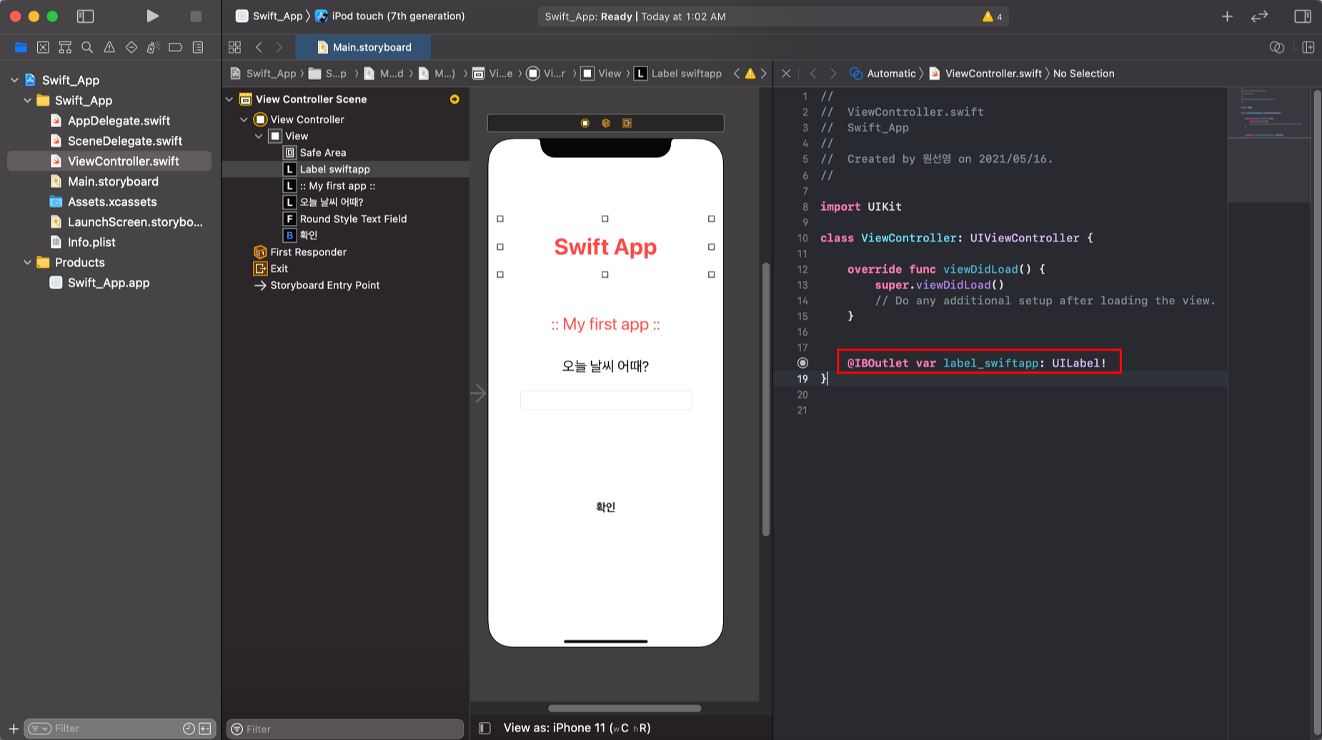 'Swift App'이라는 Label 객체에 대해서 아웃렛 변수를 추가하겠습니다.