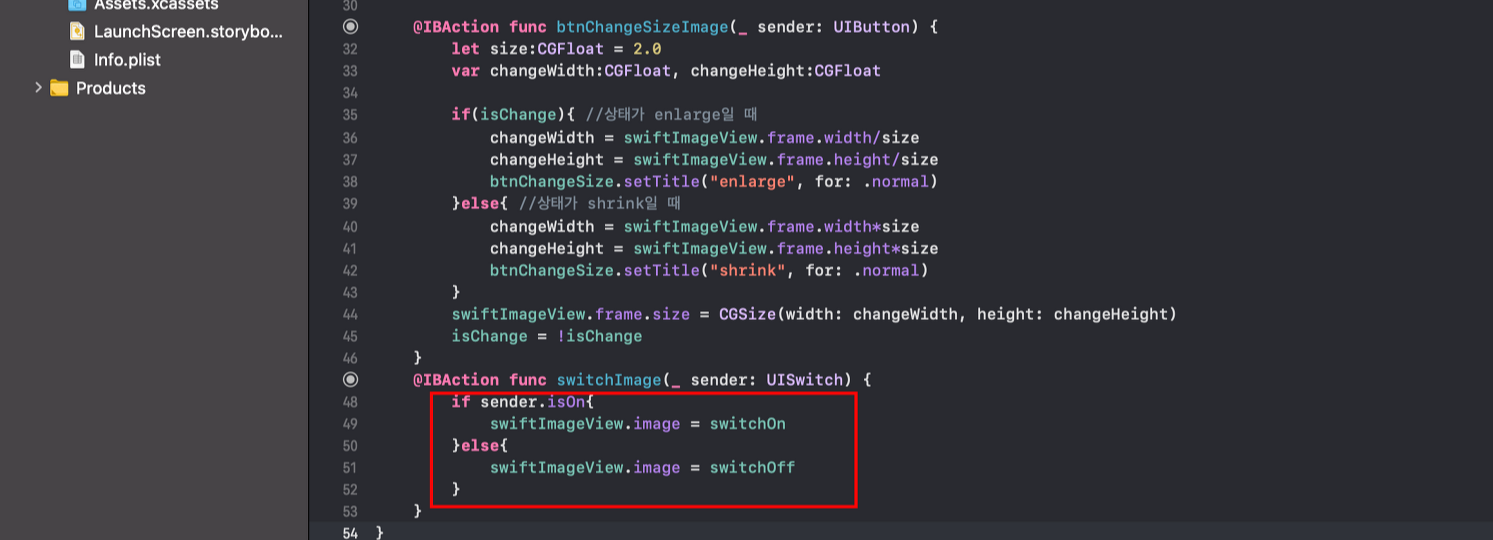 다음으로는 이미지를 지정해주도록 하겠습니다. [viewDidLoad] 함수 안에 위에서 선언한 switchOn, switchOff 변수에 이미지를 지정해주도록 하겠습니다.