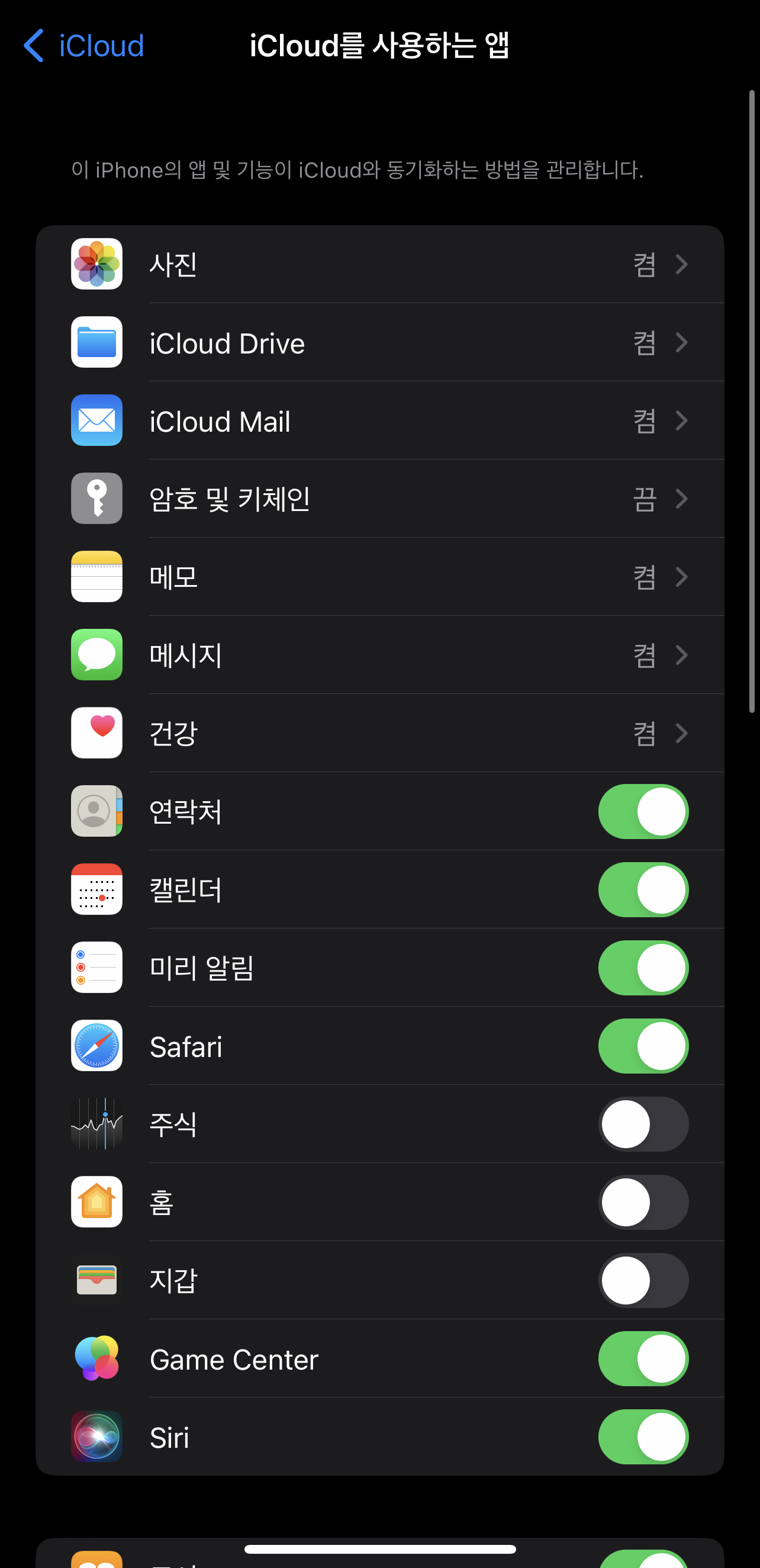 가운데 영역에서는 아이클라우드를 사용하는 앱을 확인할 수 있습니다. 어떤 앱들에서 아이클라우드를 연동하여 데이터를 연동할 수 있는지 확인가능합니다.