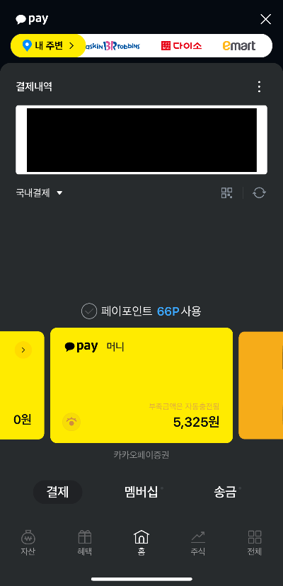 그러면 상단에 바코드 또는 QR코드가 나옵니다. 바코드가 제일 먼저 나오는데 오른쪽으로 밀어보시면 QR 코드도 나옵니다. 가게에서 카카오페이 간편결제를 할 때 상황에 따라서 바코드 또는 QR코드를 보여주신 다음에 결제를 진행하시면 됩니다. 간편하죠?