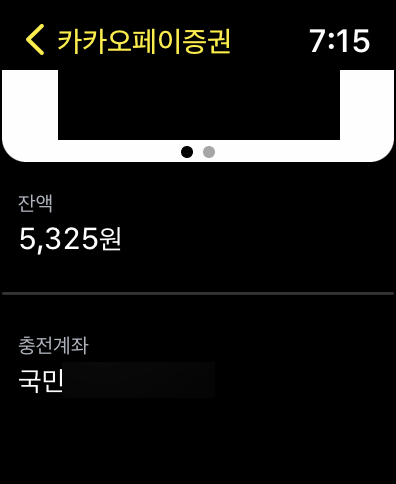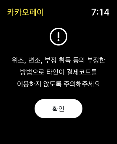 애플워치에서 카카오페이를 처음 실행하는 경우에는 위와 같이 '위조, 변조, 부정 취득 등의 부정한 방법으로 타인이 결제코드를 이용하지 않도록 주의해주세요'라는 안내 문구가 나옵니다. 확인을 눌러주시면 됩니다.