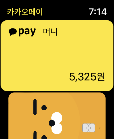 이렇게 애플워치에서도 카카오페이를 사용할 수 있어서 핸드폰 없이 애플워치만 있는 상태에서도 결제가 가능합니다. 핸드폰과 동일하기 때문에 쉽고 간편하게 등록해둔 카드를 선택해서 결제를 할 수 있습니다.