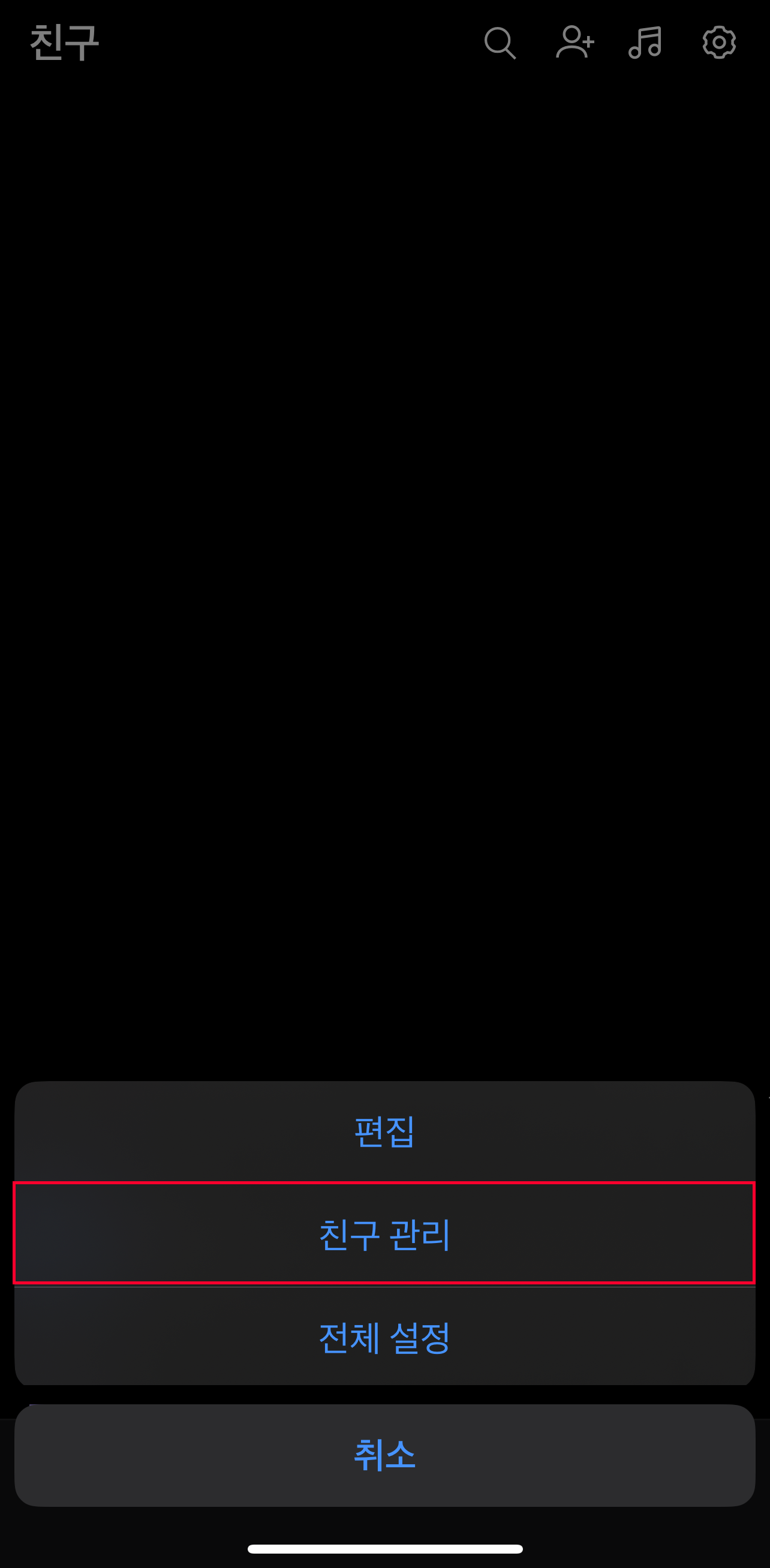 카카오톡 친구 목록 페이지로 와서 우측 상단에 있는 [설정] 톱니바퀴를 누릅니다. 그럼 하단에 옵션 창이 나오는데 여기에서 [친구 관리]를 눌러주세요.