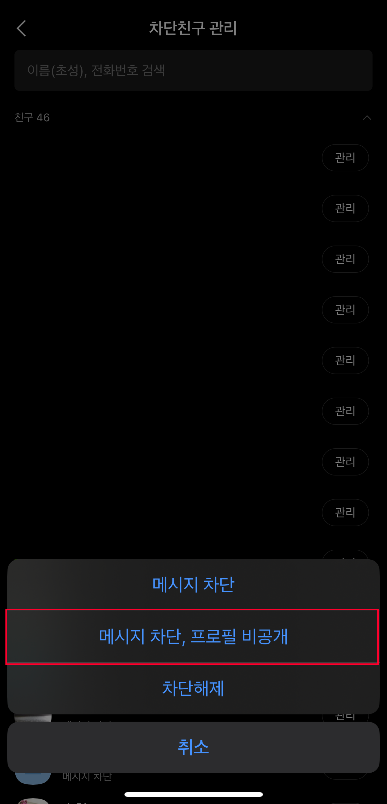 그럼 위와 같이 창이 하나 뜨는데 단순히 '메시지 차단'인 경우에는 여기에서 내가 차단당했는지 안당했는지 알아내기는 어렵습니다. '메시지 차단 및 프로필 비공개'인 경우 여기에서 바로 차단당했다는 것을 확인할 수 있지만 일반적인 차단으로는 확인하기가 어렵습니다.