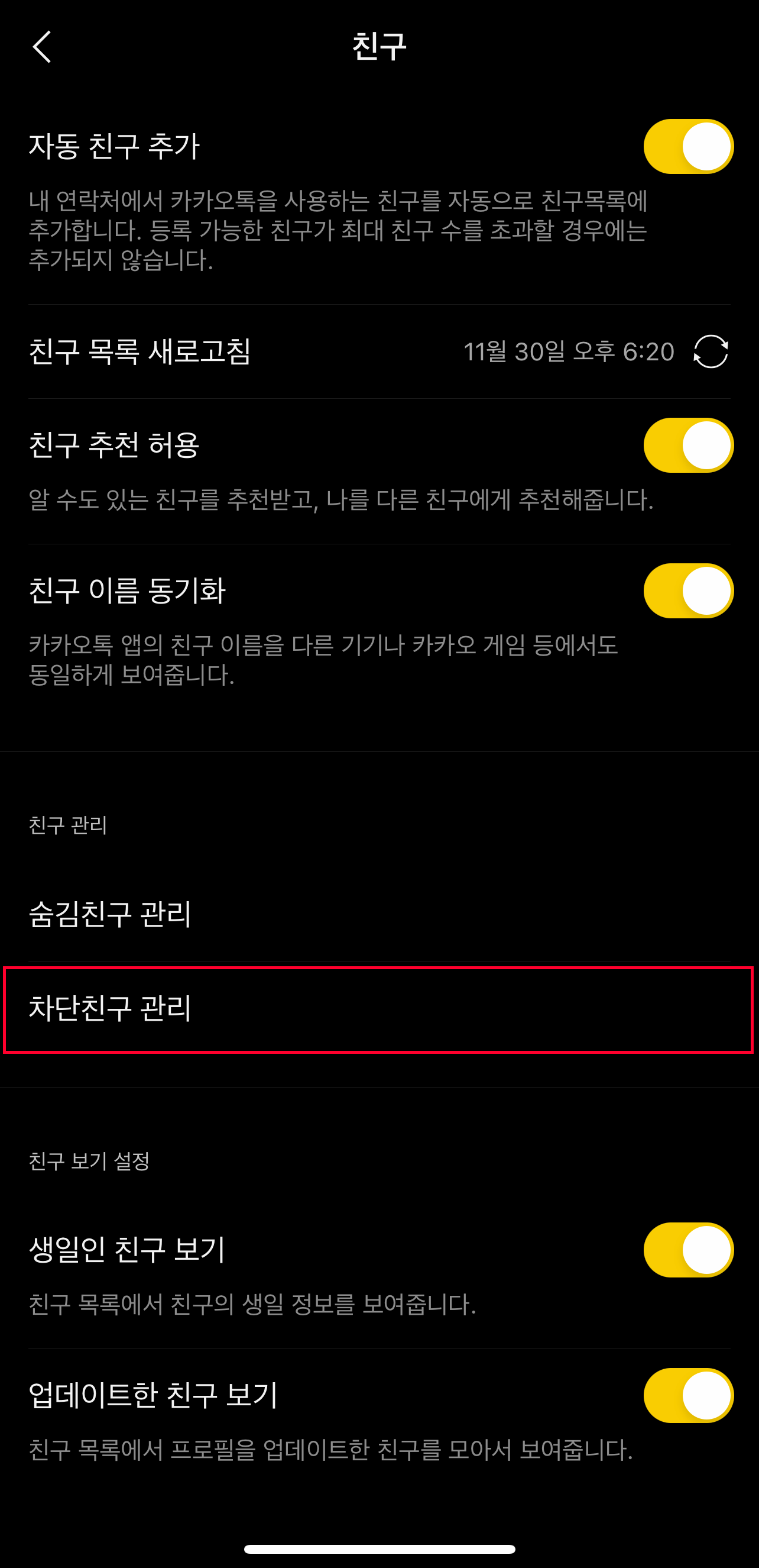 그럼 친구 설정 페이지로 이동하게 됩니다. 여기에서 [친구 관리] - [차단친구 관리]를 눌러서 차단 친구 관리를 해보도록 하겠습니다.