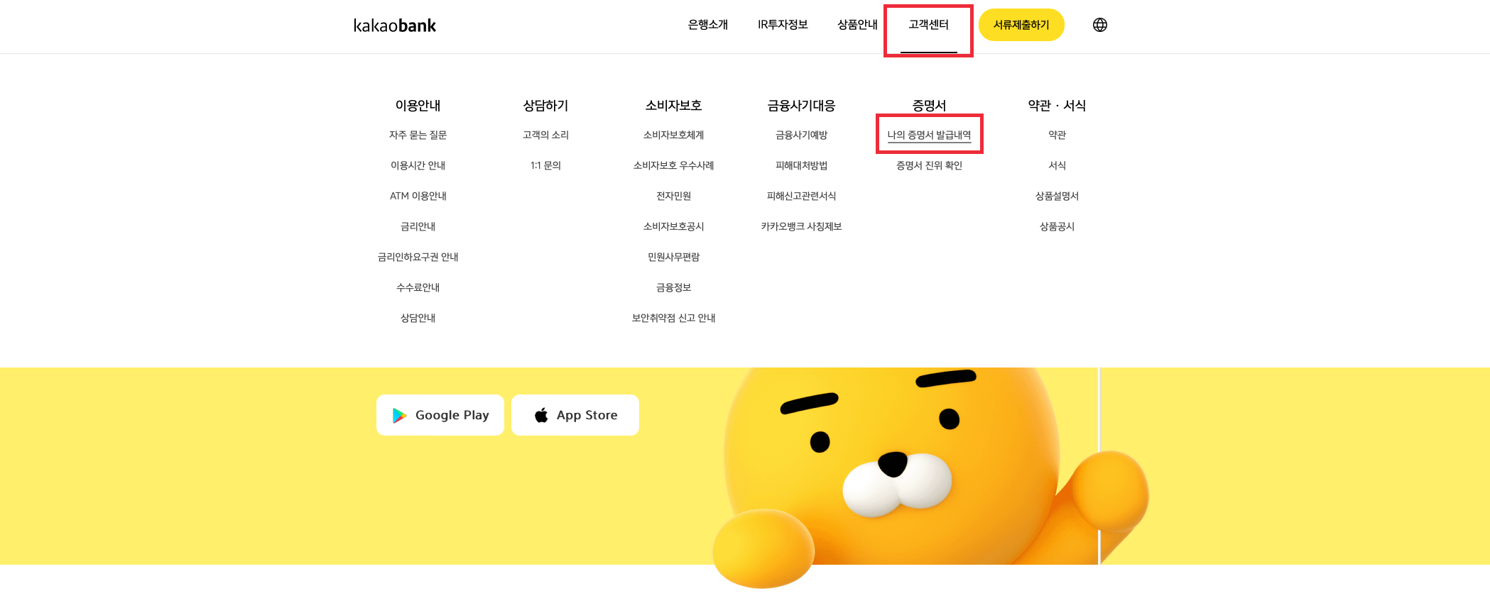 카카오뱅크 홈페이지에 접속하시면 상단에 [고객센터] 메뉴가 있습니다. 해당 메뉴를 클릭하시고 나서 [나의 증명서 발급 내역] 메뉴를 눌러주세요.
