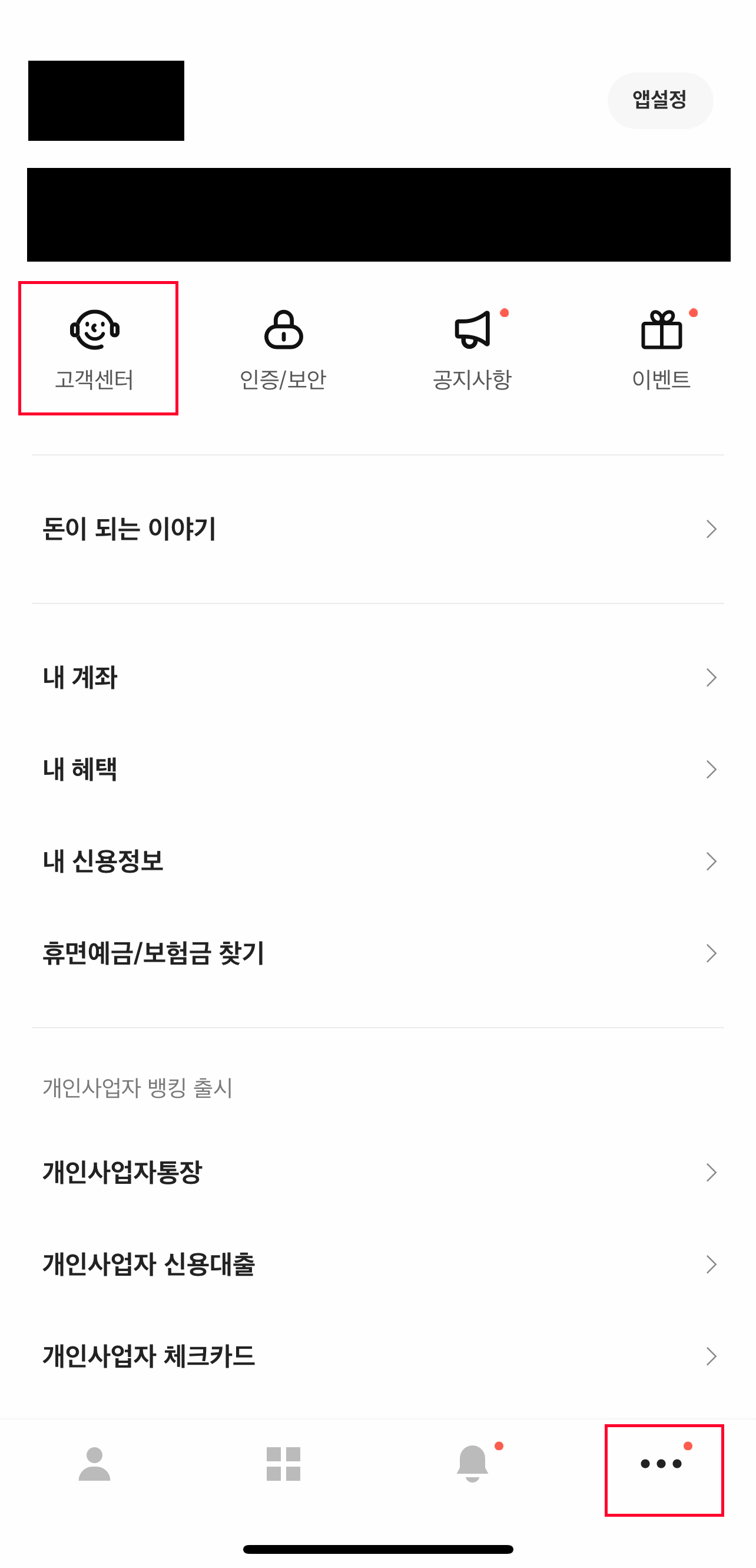 그럼 이 통장사본을 출력하려면 어떻게 해야 할까요? 이미지로 저장한 걸 출력해야되나요? 싶으실텐데 따로 통장사본 출력하는 방법이 있습니다. 카카오뱅크 앱 하단 맨 오른쪽에 있는 메뉴를 누르신 다음에 상단에 [고객센터]를 눌러주세요.