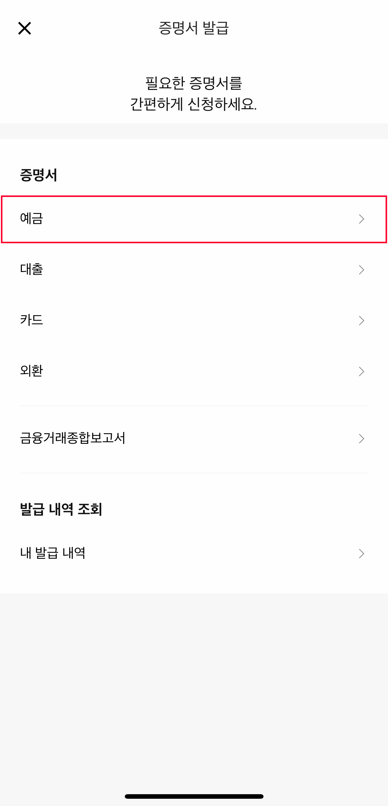 고객센터 아래쪽에 보시면 [증명서 발급] 이라는 메뉴가 있습니다. [증명서 발급]을 누르고나서 필요한 증명서를 선택해주시면 됩니다. 저는 예금 계좌에 대한 통장사본 출력을 위해 [예금]을 눌러줍니다.