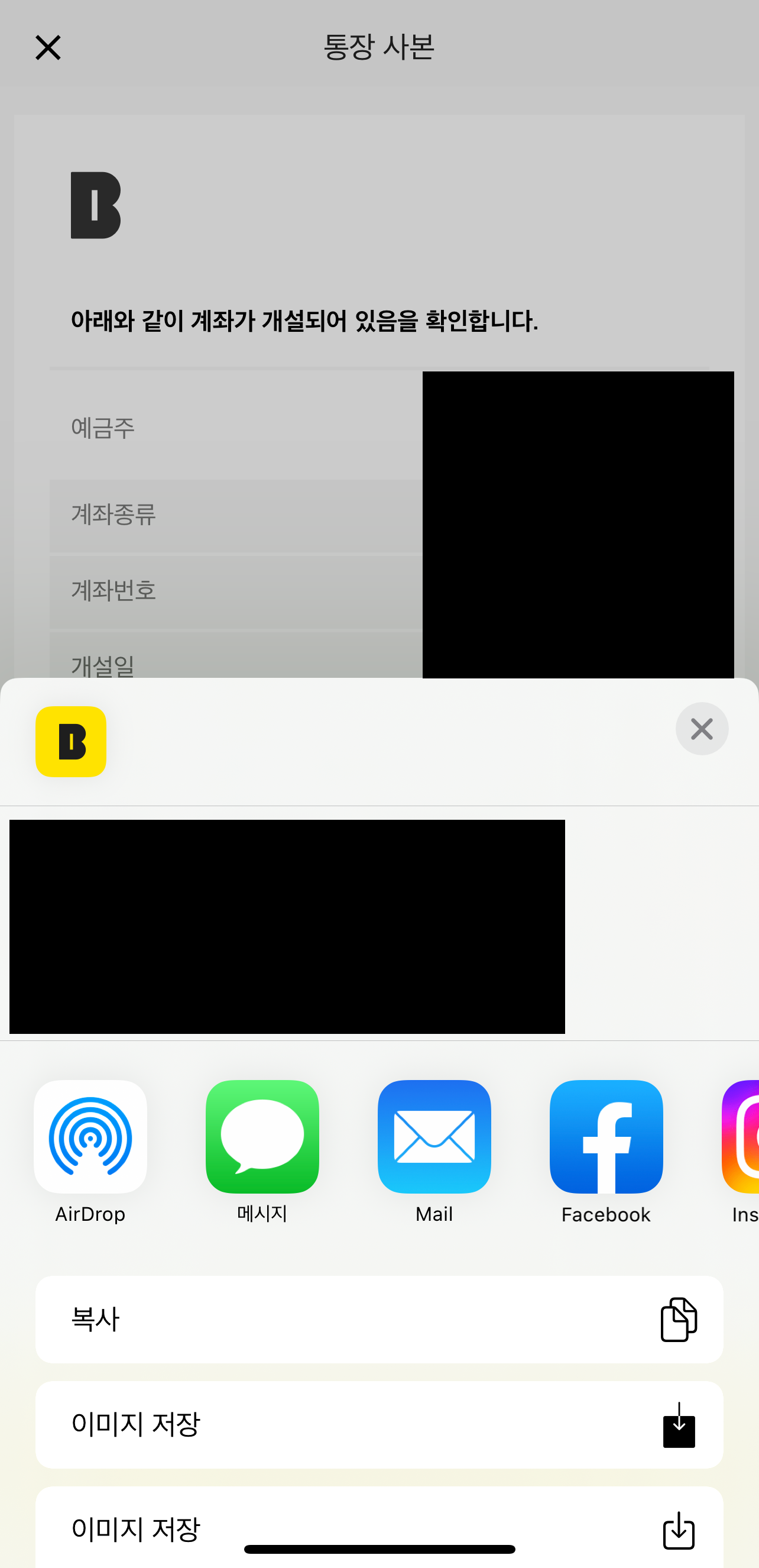 그러면 해당 계좌에 대한 통장 사본을 확인할 수 있습니다. 이 통장 사본은 따로 저장할 수 있는데 [저장하기]를 누르면 오른쪽과 같이 아래에서 옵션 창이올라옵니다. 여기에서 이미지로 저장할 건지, 다른 방법으로 저장할 건지 여러 방법중에서 선택하신 다음 통장사본 저장하고 내보내기도 가능합니다.