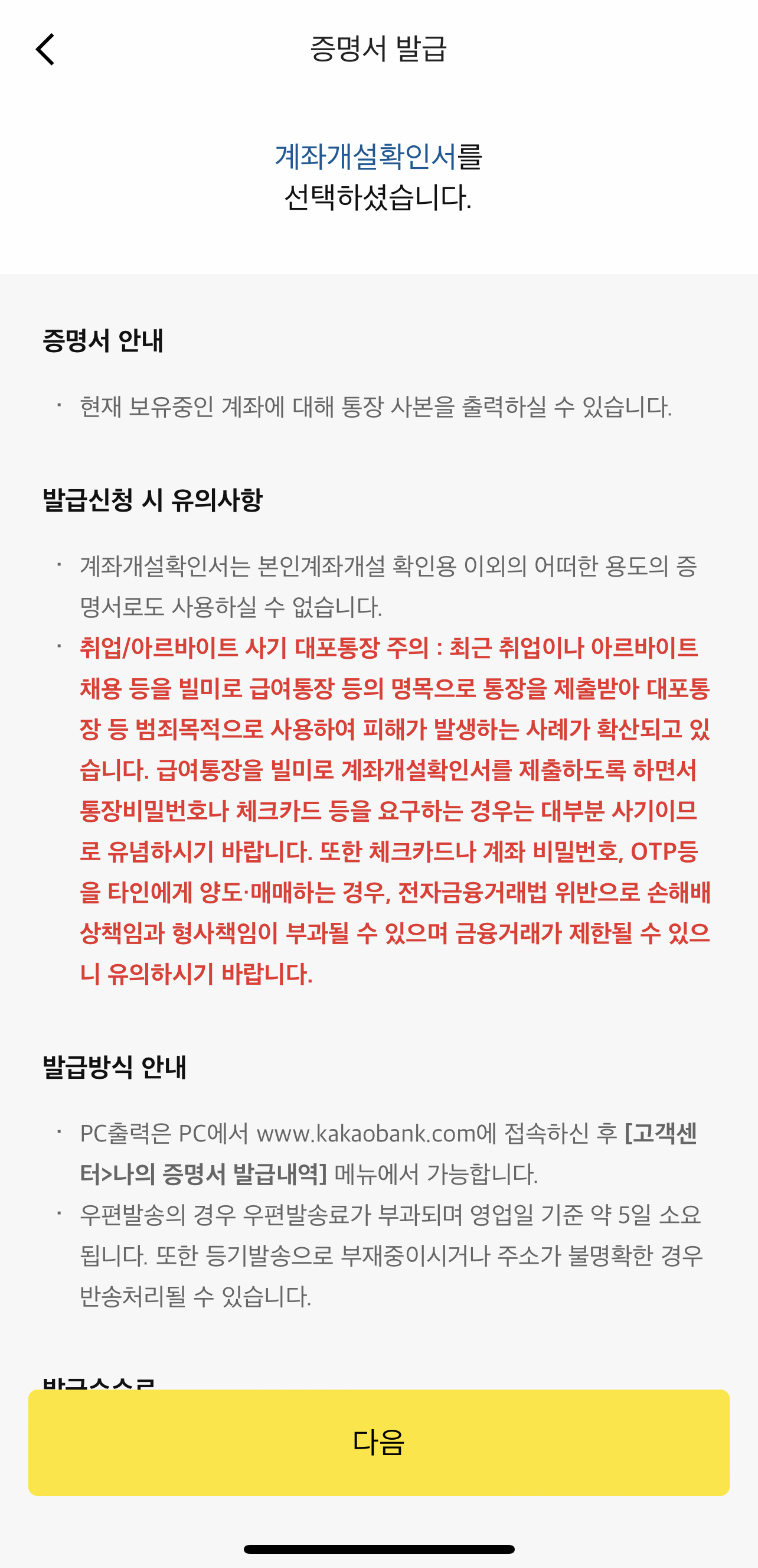 그럼 예금 중에서도 어떤 증명서를 발급받을 건지 선택해주셔야 합니다. 저는 통장사본이기 때문에 [계좌개설확인서]를 선택하고 증명서 발급을 진행하겠습니다. [계좌개설확인서]를 누르면 증명사 발급 안내에 대한 설명이 나옵니다. 차근차근 읽어보고 다음을 눌러줍니다.