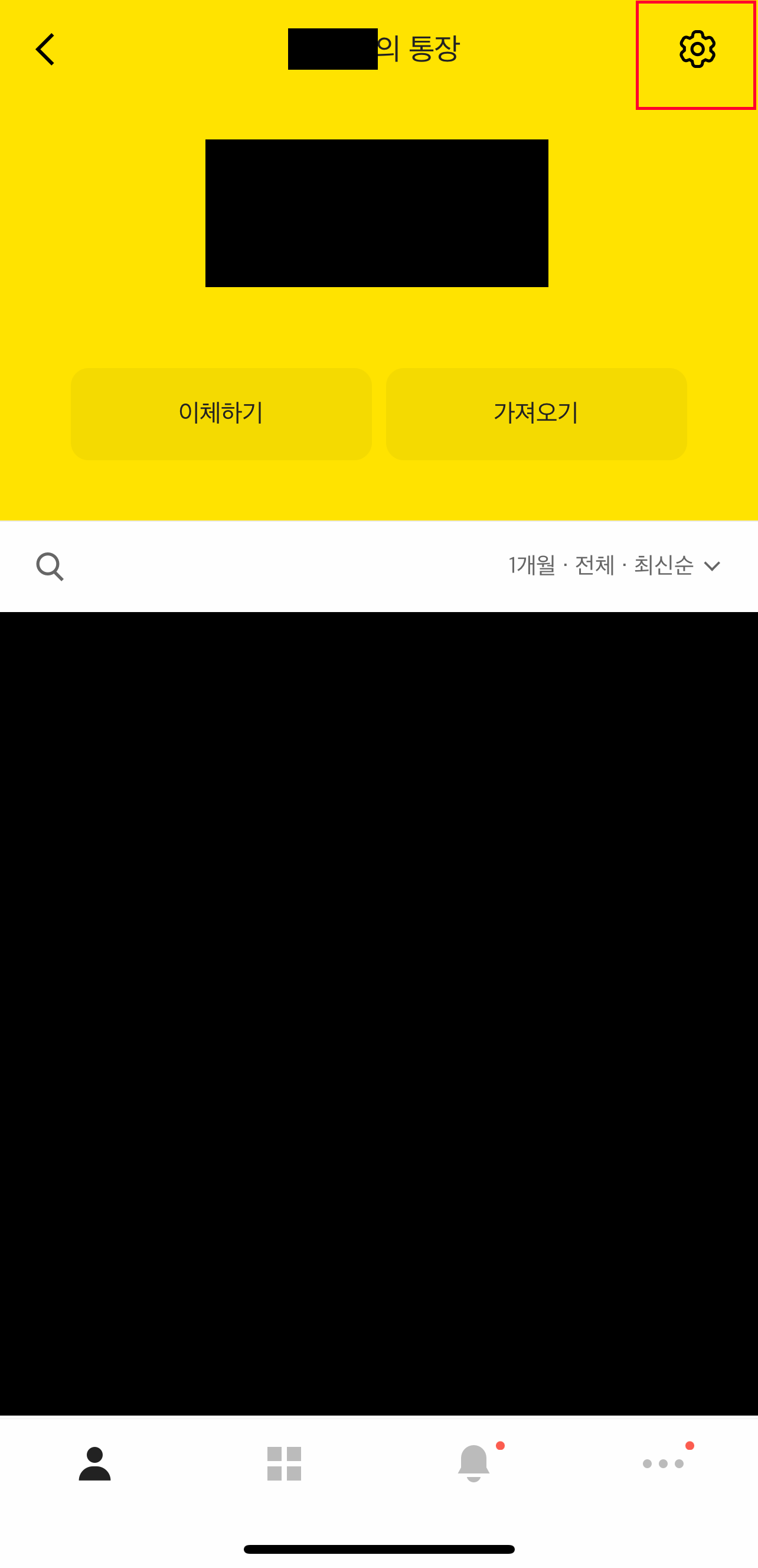 먼저, 카카오뱅크를 실행하신 다음에 통장사본 출력을 하고자하는 계좌를 눌러주세요. 그럼 해당 계좌 통장으로 들어오게 되는데 여기에서 우측 상단에 있는 [설정] 버튼을 눌러주세요.