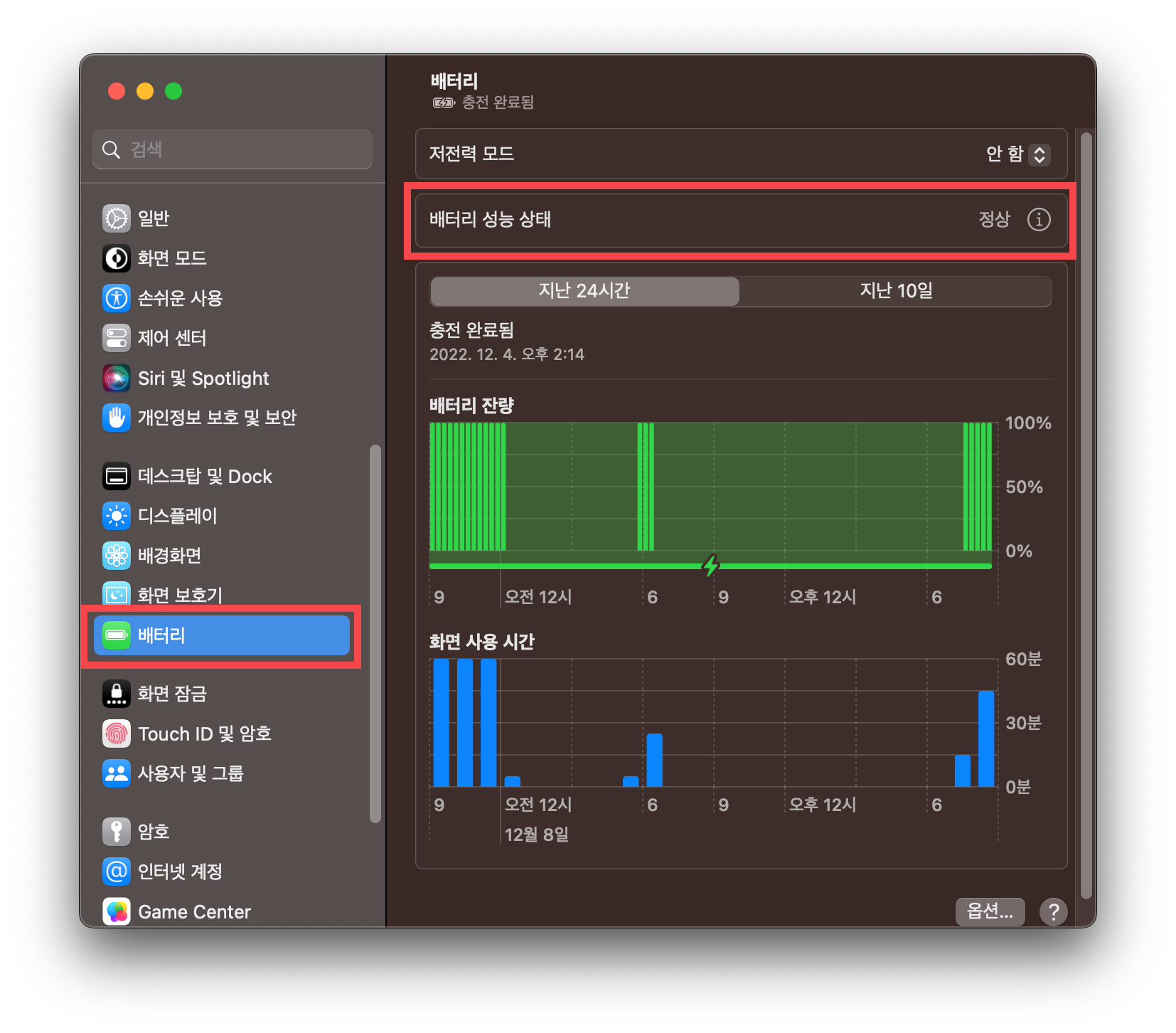 다른 방법으로 배터리 성능을 쉽게 확인할 수 있는 방법은 [시스템 설정] 창에서 [배터리]를 누르신 다음 [배터리 성능 상태]를 누르시면 보다 쉽고 빠르게 맥북 배터리의 성능 상태를 확인할 수 있습니다. [배터리 성능 상태]를 눌러보도록 하겠습니다.
