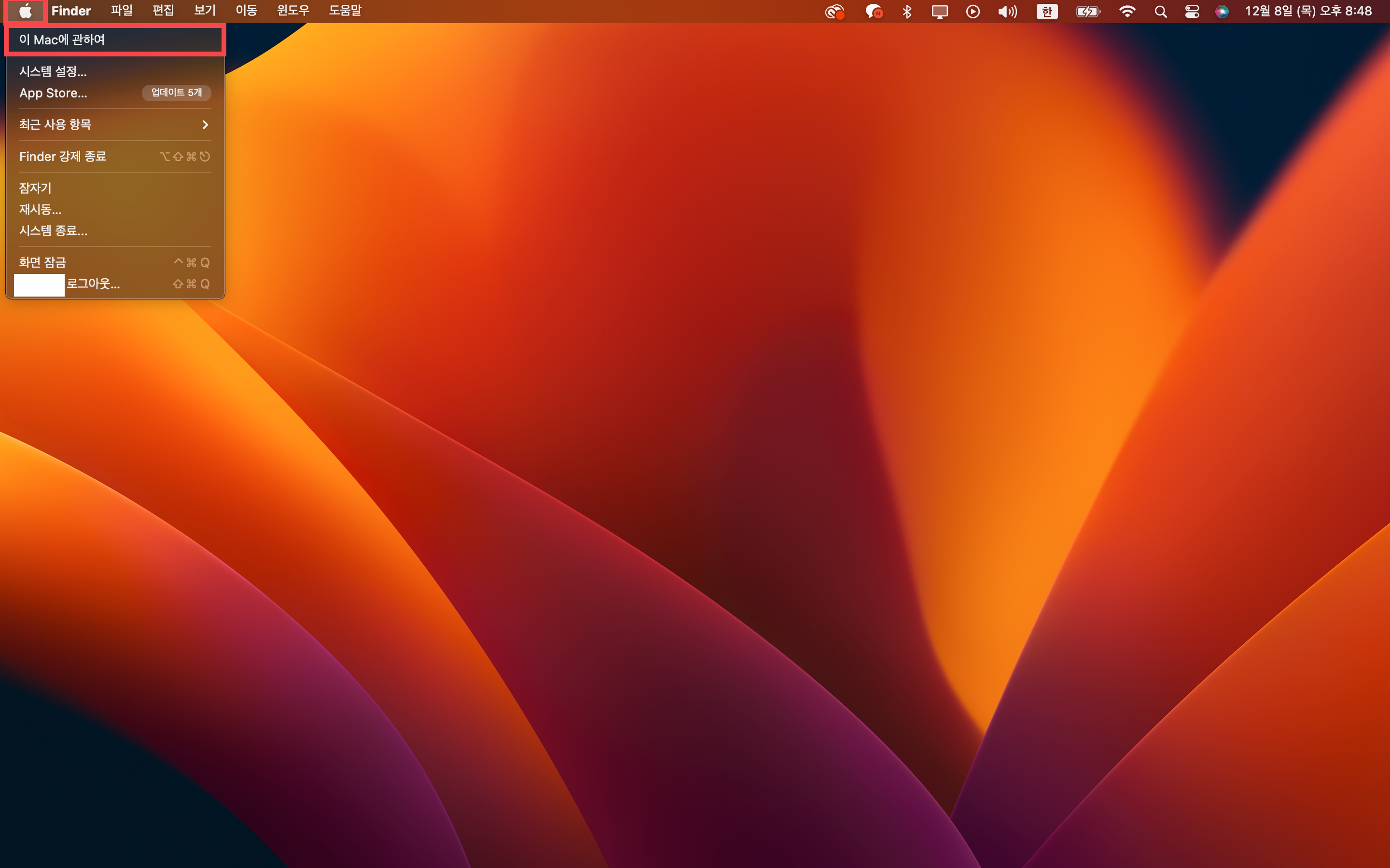 왼쪽 상단 [애플 로고]를 클릭하신 다음 [이 MAC에 관하여]를 눌러주세요.