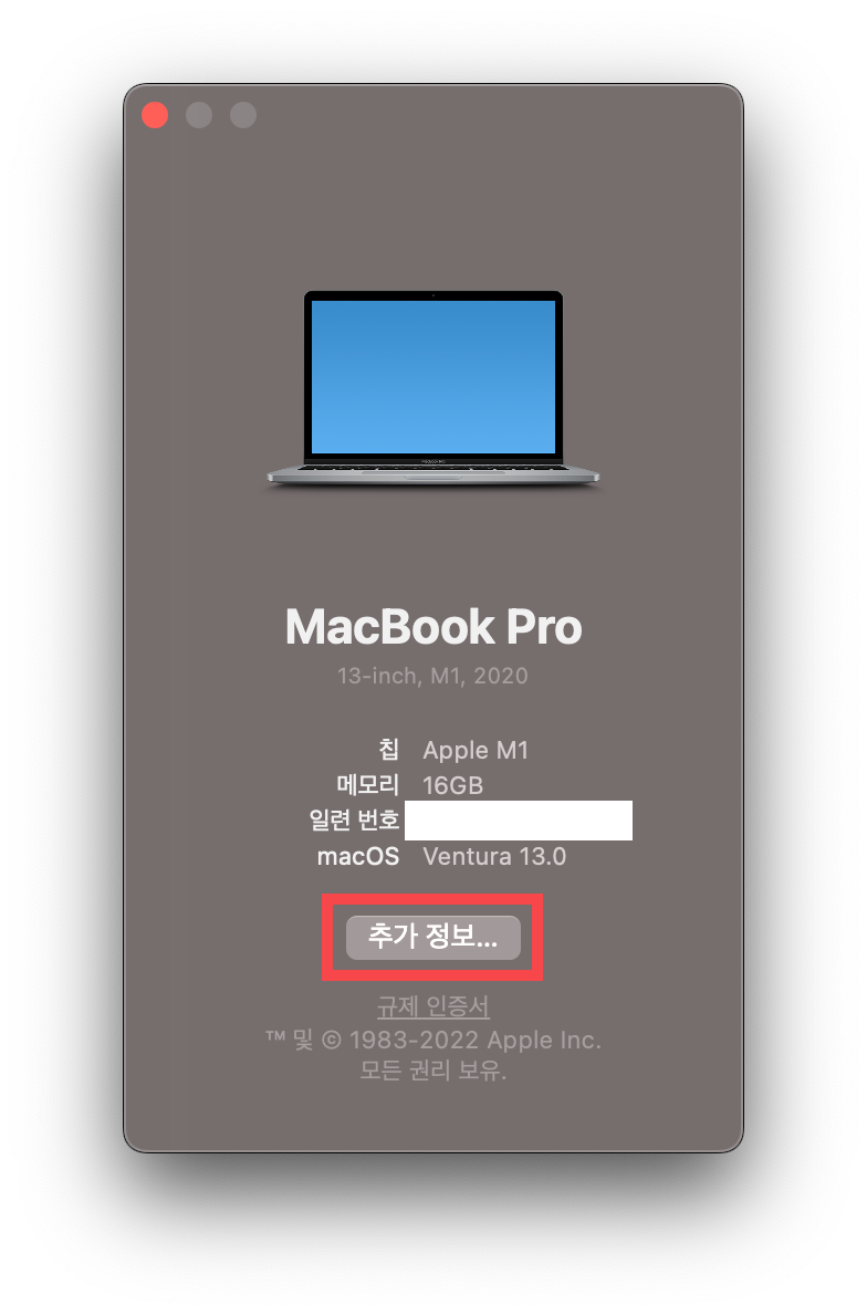 그러면 위와 같은 창이 하나 나오실거예요. 이 창에서는 맥에 관한 정보, 메모리나 일련 번호, 현재 맥 버전 등만 확인이 가능하기 때문에 저희는 배터리 성능을 확인하기 위해서 [추가 정보...]를 눌러주시면 됩니다.