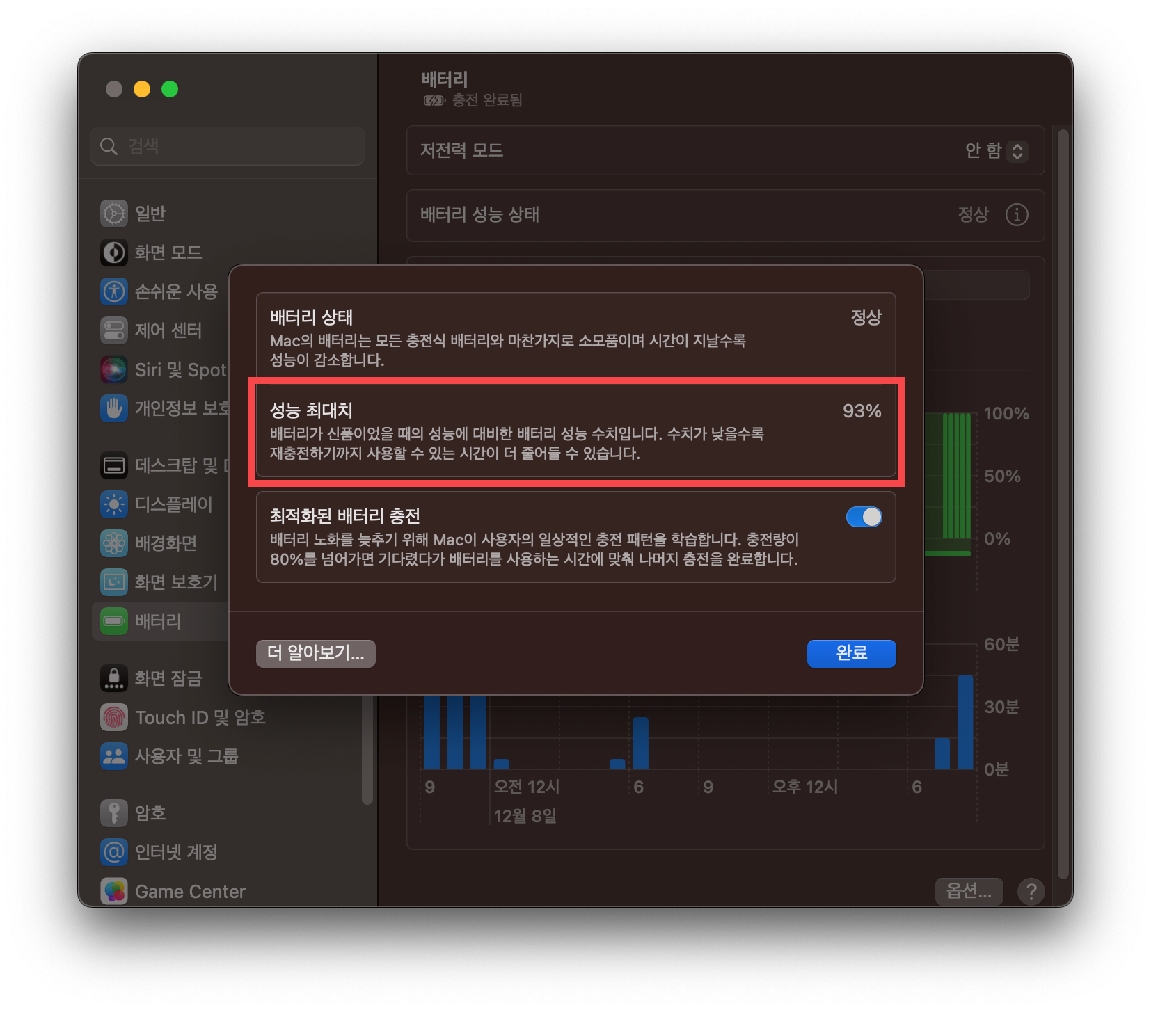 [배터리 성능 상태]를 눌러보시면 현재 배터리의 상태가 정상이라는 것과 성능 최대치의 수치도 확인가능합니다. 그리고 배터리는 사용하면 사용할수록 거기에 맞춰서 사용되는 부분이기 때문에 어떻게 잘 관리하면서 사용하는지가 중요한데요. 배터리 성능 상태에서 [최적화된 배터리 충전]을 활성화 해주시면 배터리 노화를 늦추기 위해서 맥북이 사용자의 충전 패턴을 확습해서 충전량이 80%를 넘어가면 기다렸다가 배터리를 사용하는 시간에 맞춰서 나머지 충전을 완료해줍니다. 이런 맥북에서 지원해주는 기능을 통해 좀 더 맥북 배터리를 효율적으로 관리하면서 사용할 수 있습니다.