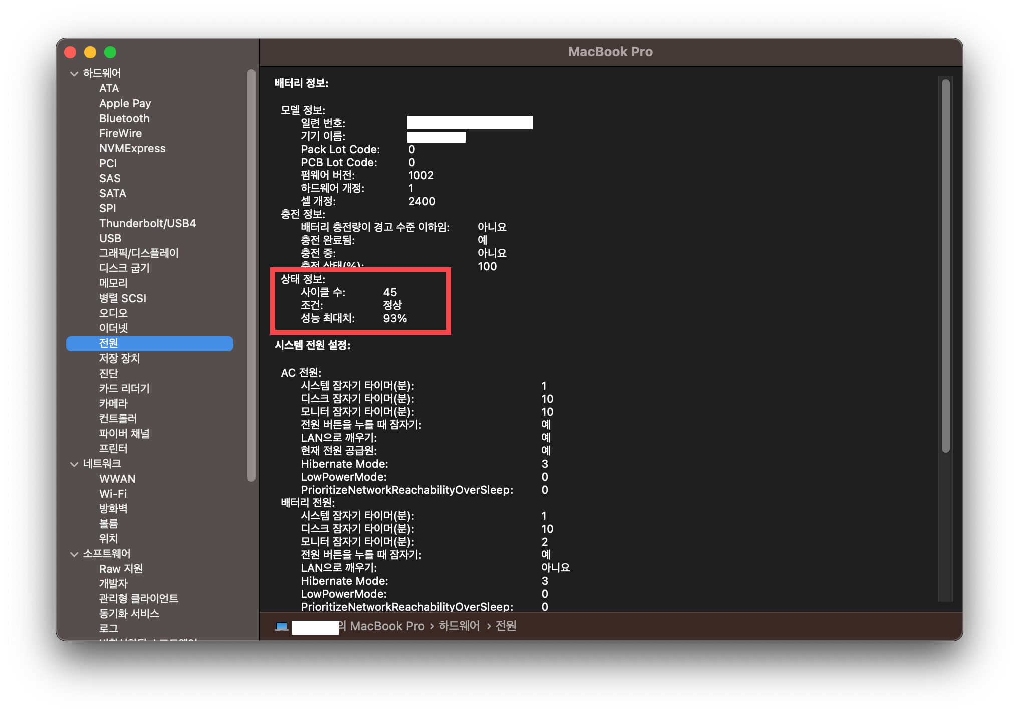 현재 저의 맥북 배터리 사이클 수는 45, 성능 최대치는 93%인 것을 여기에서 쉽게 확인할 수 있습니다.