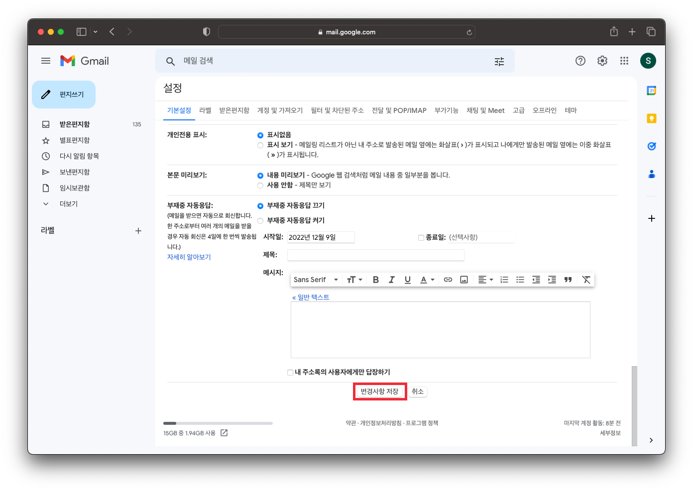 여기에서 주의하셔야 하는 부분은 시간만 바꾼 채로 메일로 돌아가시면 안됩니다. 무조건 하단으로 스크롤을 내리신 다음에 [변경사항 저장]을 눌러주셔야만 발송 취소 가능 시간 조정이 가능합니다.