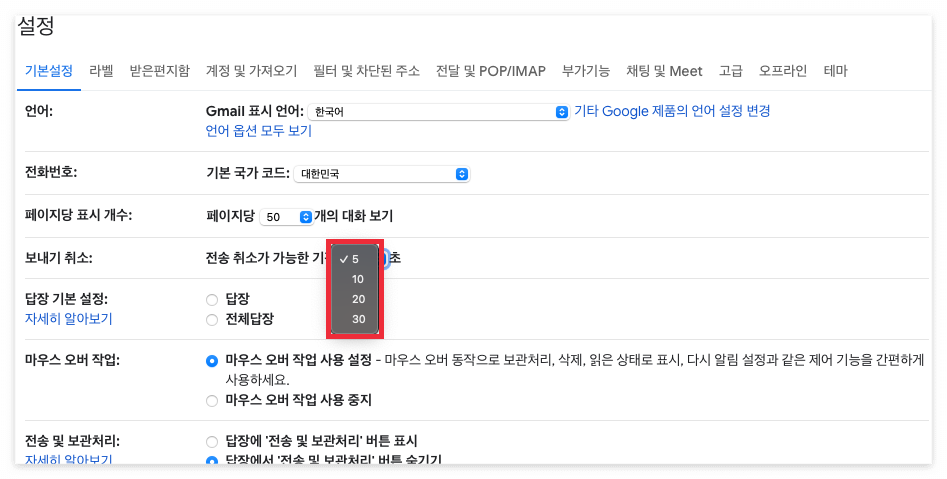 그러면 [설정] 페이지가 열립니다. 여기에서 발송 취소 버튼 클릭 가능시간을 조정하기 위해서 [보내기 취소] 영역을 확인해주시면 됩니다. 보시면 "전송 취소가 가능한 기간"을 초단위로 설정할 수 있습니다.