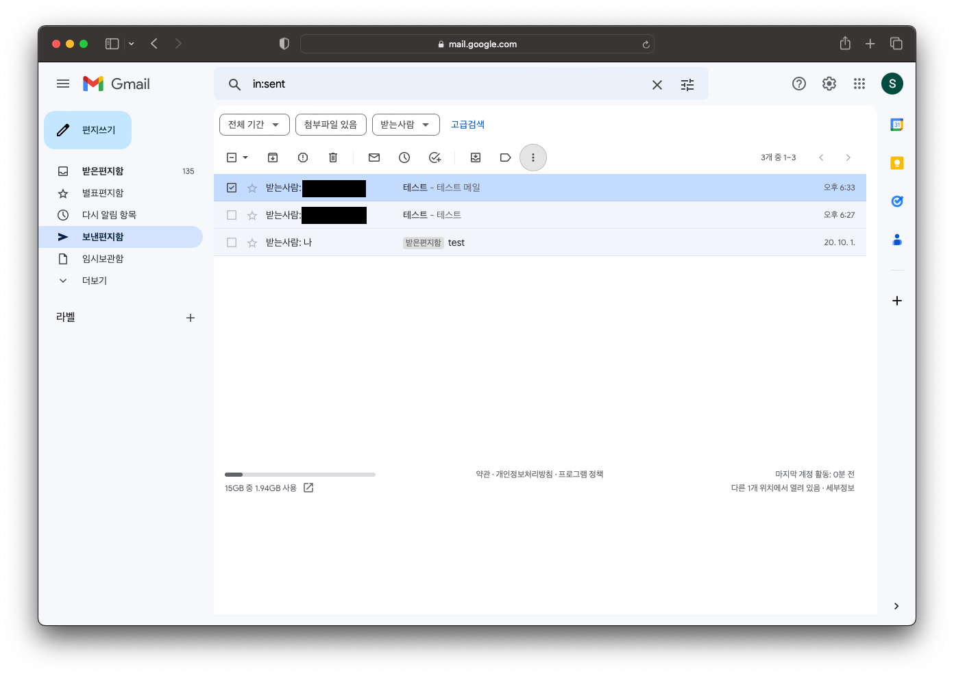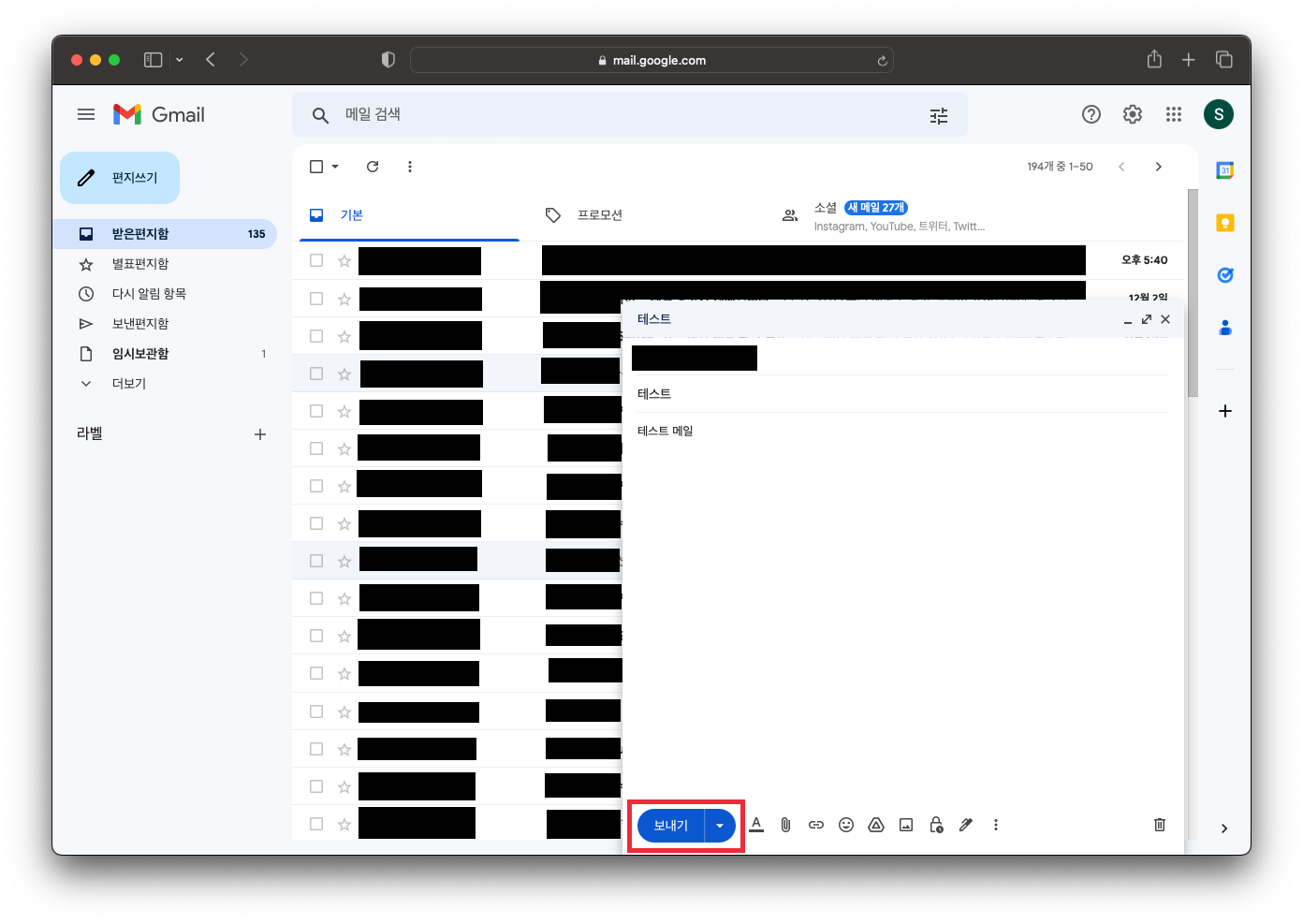 그러면 다시 메일로 돌아와서 확인을 해보도록 하겠습니다. 메일을 작성하신 다음에 처음과 똑같이 [보내기]를 눌러주세요.