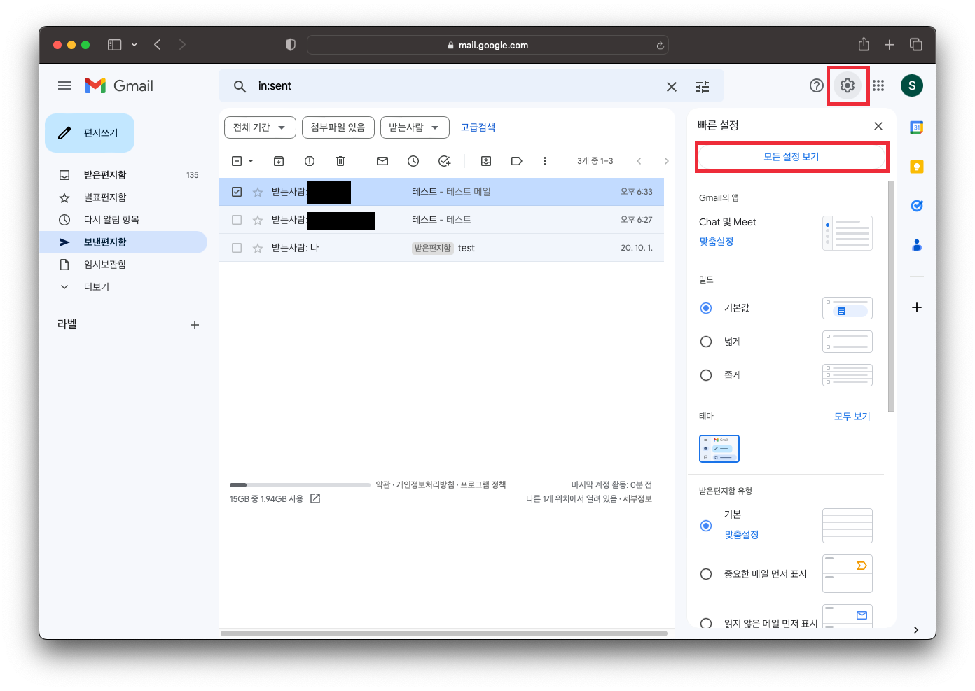 오른쪽 상단에 보시면 [설정] 버튼이 있습니다. [설정] 버튼을 누르신 다음 빠른 설정 바로 아래에 있는 [모든 설정 보기]를 눌러주세요.