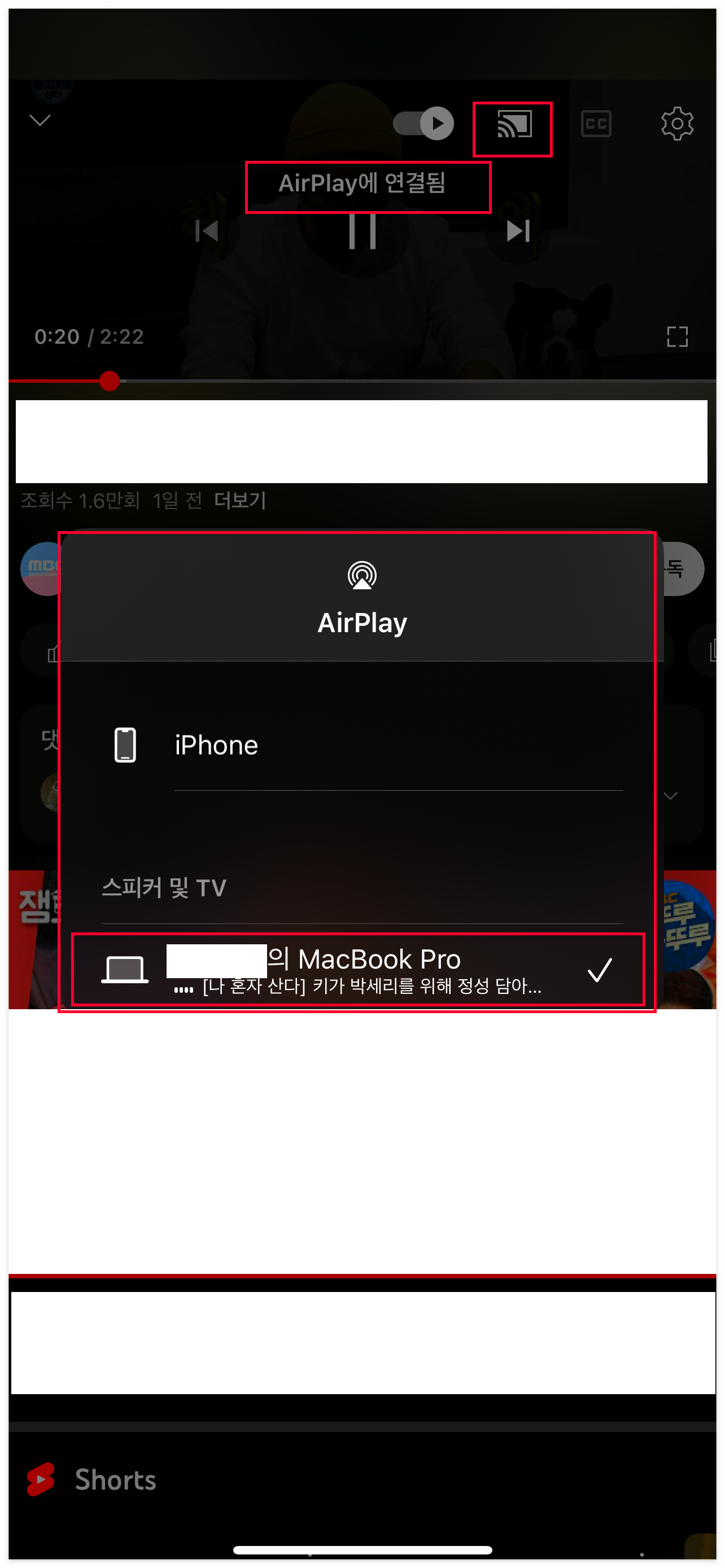 에어플레이를 연결하는 순간 아이폰에서 재생되던 영상은 멈추게 되고 화면 위로는 "Airplay 연결됨"이라고 표시됩니다. 미러링과는 다른 부분이 이 부분인 것 같습니다. 에어플레이로 연결을 하면 아이폰에서는 영상을 볼 수가 없고 연결된 기기를 통해서만 영상을 볼 수 있습니다.