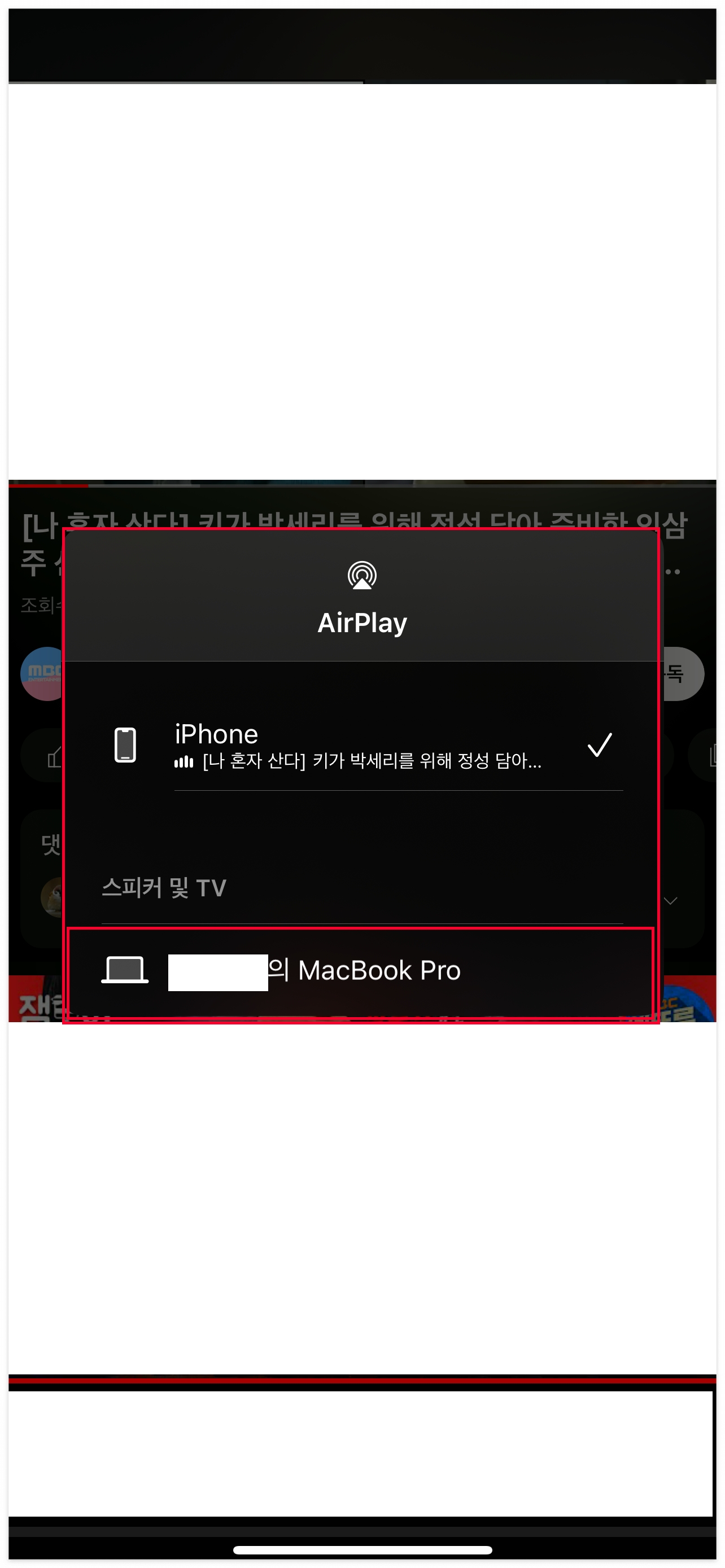 [AirPlay] 아이콘을 눌러주시면 하단에 위와 같은 창이 하나 보여지실거예요. 여기에서 [AirPlay 및 블루투스 기기]를 눌러서 에어플레이를 진행해주시면 됩니다.