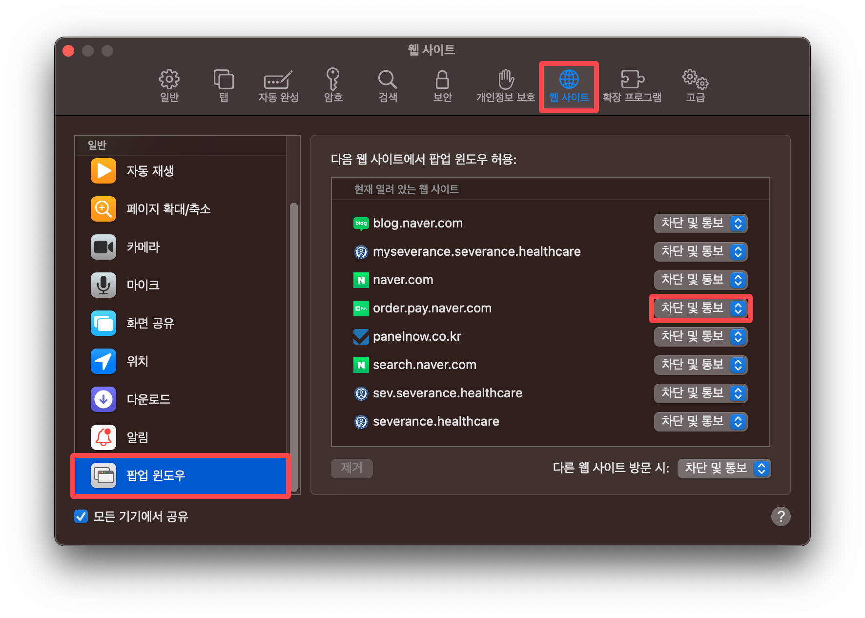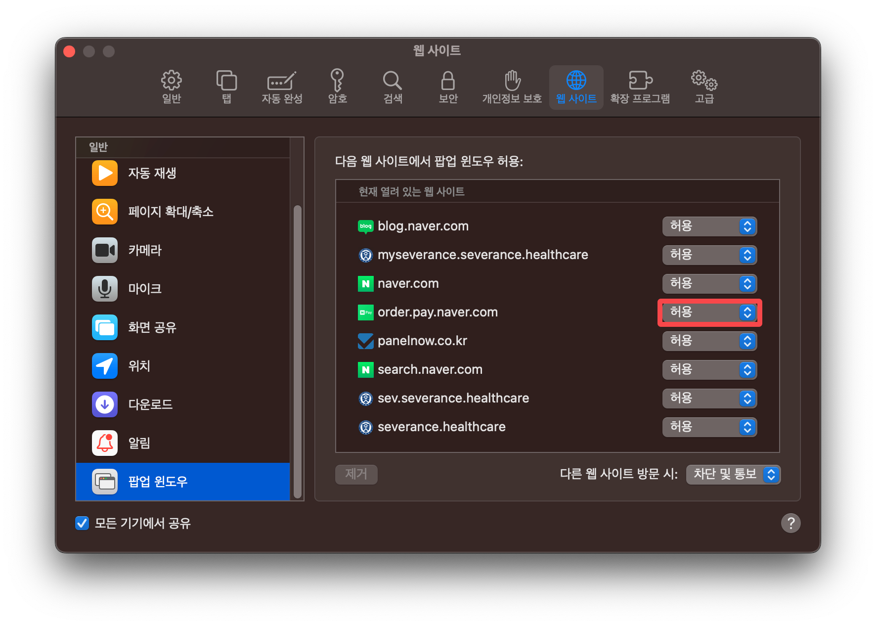 각각의 사이트들을 별도로 팝업 설정도 가능하지만 모든 사이트들에 대한 팝업을 한 번에 설정하는 것도 가능합니다. 매번 필요한 순간에 팝업이 차단되서 불편하시다면 이렇게 설정해주시면 보다 편하게 사파리 브라우저를 사용하실 수 있으실 것 같습니다.