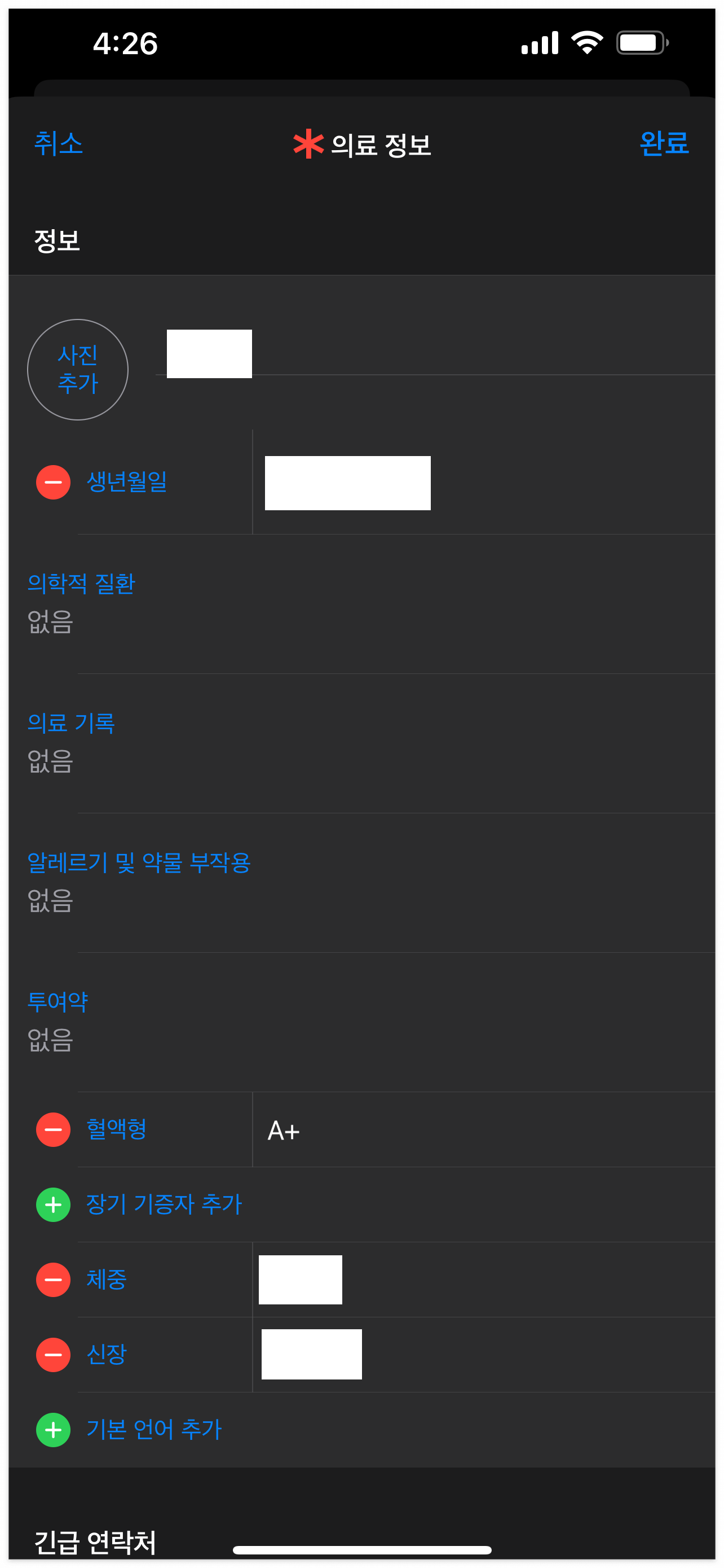 의료정보 편집화면으로 들어오시게 되면 이름과 생년월일, 사진, 의학적 질환, 의료 기록, 알레르기 및 약물 부작용, 투여약, 혈액형, 장기 기증자 추가, 체중, 신장 등에 대한 정보를 설정할 수 있습니다. 또한, 긴급 구조로 요청할 시 내가 긴급 서비스에 전화를 걸었다는 것을 알릴 수 있는 긴급 연락처도 추가할 수 있습니다. 의료정보에서 중요한 것은 긴급상황 접근에 대한 설정입니다. 긴급상황 시 아이폰 암호 없이도 의료정보를 확인해야 빠르게 대처가 가능한데 이때 [잠겨 있을 때 보기]를 활성화 해주시게 되면 아이폰이 잠겨있을 때에도 의료정보를 확인할 수 있게됩니다. 또한, 이러한 의료정보는 제일 하단에 있는 [의료 정보 삭제]를 통해 정보 삭제도 가능합니다.
