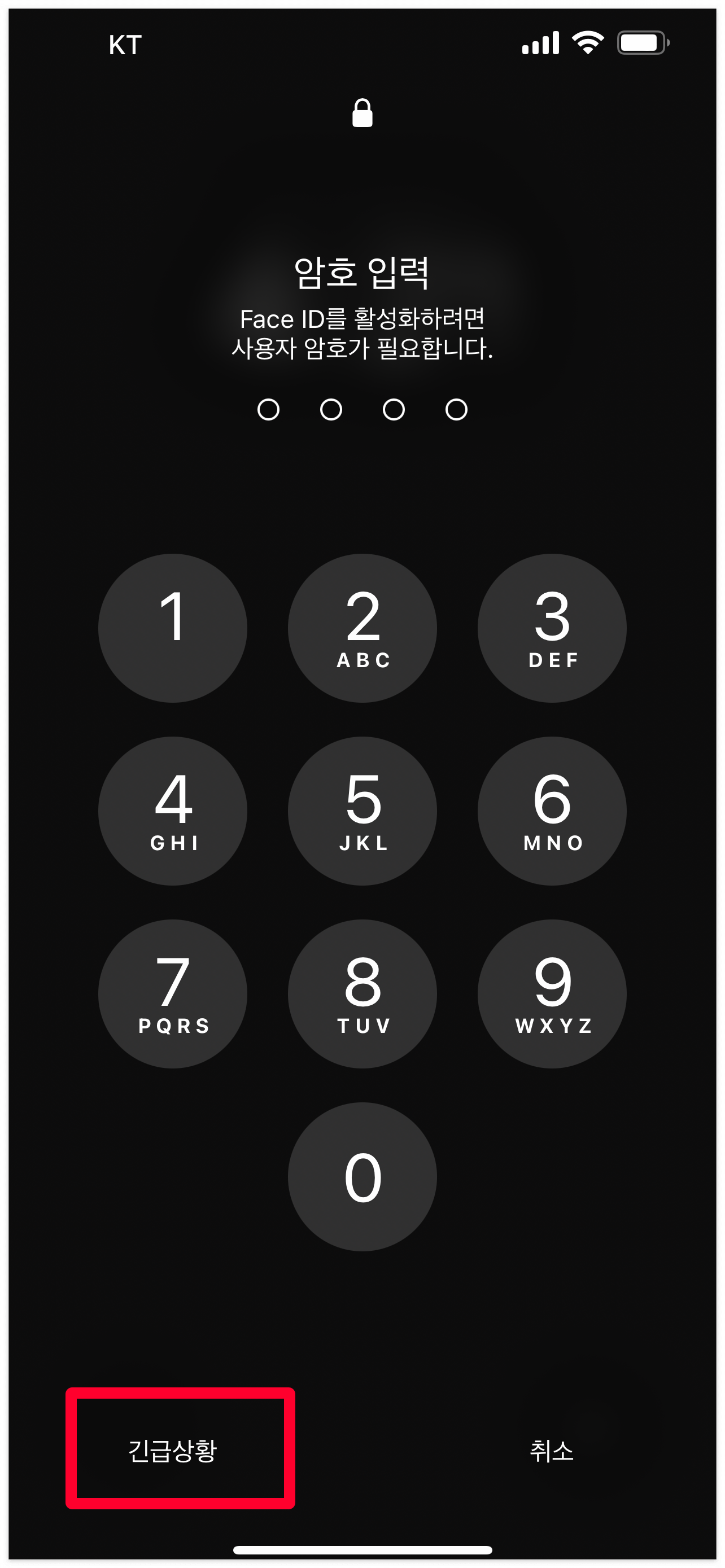 먼저, 아이폰 잠금 화면에서 긴급구조요청 가능합니다. 예기치못한 상황에서 암호를 입력할 수 없을 때 잠금화면에서 바로 전화가 가능합니다. 하단에 있는 [긴급상황]을 눌러주세요.