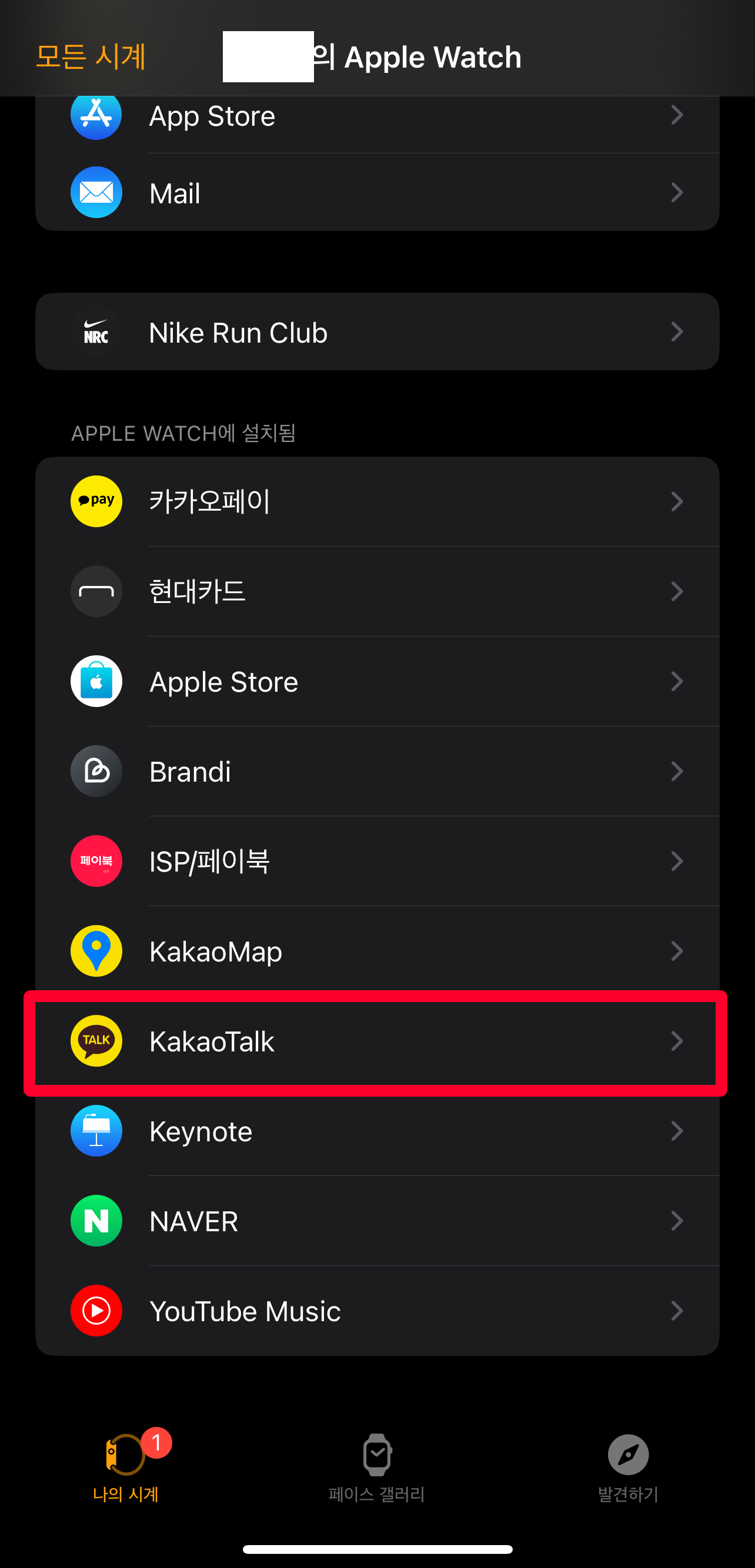 마지막으로 확인해볼 수 있는 방법은 과연 카카오톡이 애플워치에 연결이 되어 있는지를 봐주셔야 합니다. 아이폰 내 카카오톡 알림 설정은 완료했지만 알고보니 애플워치에 연결조차 되어 있지 않다면 아무런 소용이 없으니까요. 애플워치 앱 메인 화면에서 제일 아래로 내려보시면 [APPLE WATCH에 설치됨]이라고 애플워치에 설치된 어플 목록이 나옵니다. 여기에서 [KakaoTalk]을 누르시면 "Apple Watch에서 앱 보기" 항목이 있습니다. 이 항목이 활성화 되어있는지 확인해주시고 비활성화 되어 있다면 활성화해주세요.