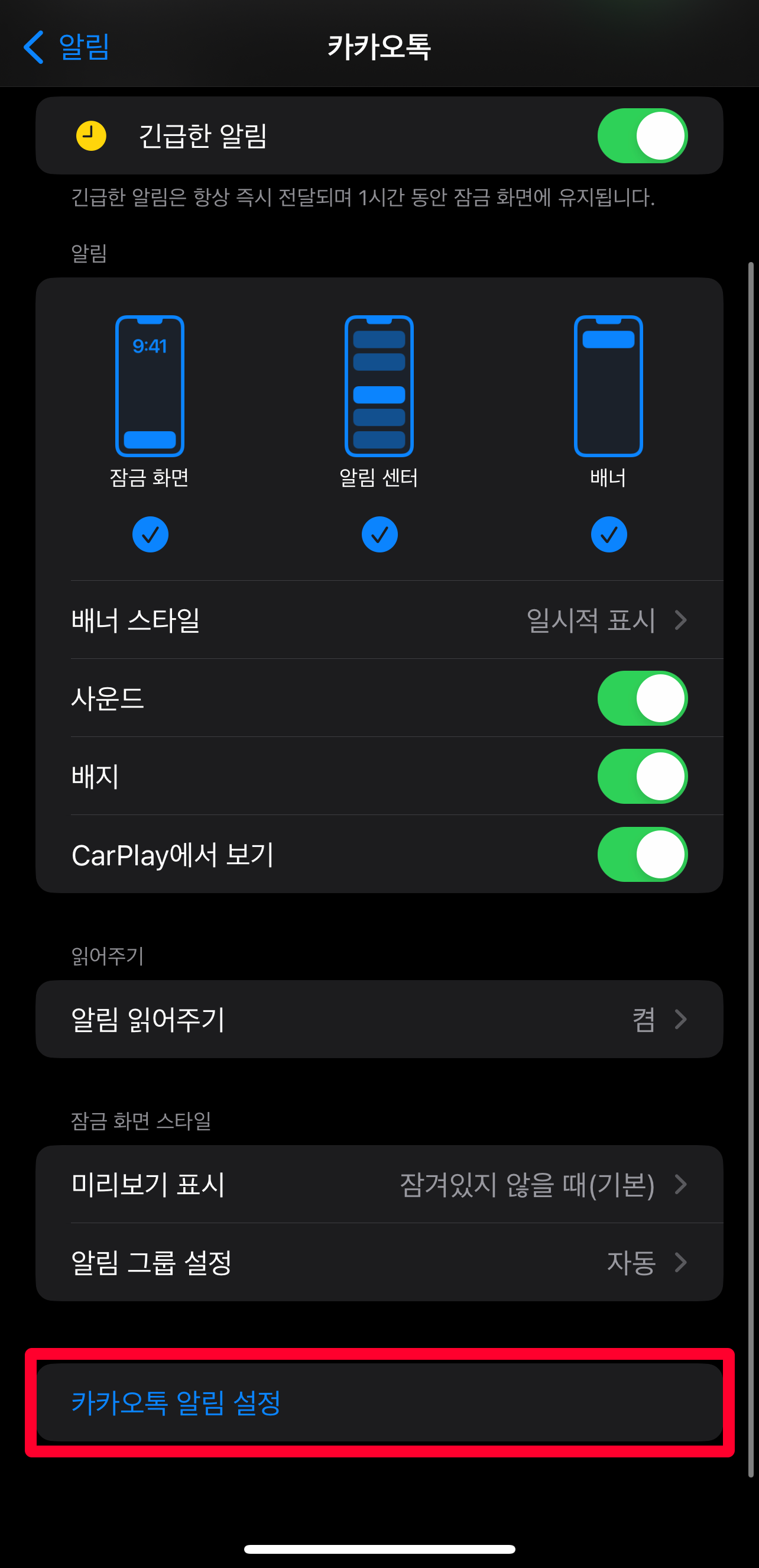 다음으로는 카카오톡 내에 알림이 설정되어 있는지도 확인해주셔야 합니다. [설정 -알림 - 카카오톡]에서 아이폰내 카카오톡 알림을 먼저 확인하신 다음에 스크롤을 제일 아래로 내려보시면 [카카오톡 알림 설정] 항목이 있습니다. 이 항목을 누르시면 바로 카카오톡 내 설정-알림으로 이동하게 됩니다. 여기에서 알림음이 제대로 설정되어있는지, 무음으로 되어 있지는 않은지, 각각의 항목들에 대한 알림도 잘 설정되어 있는지 확인해주시면 됩니다.